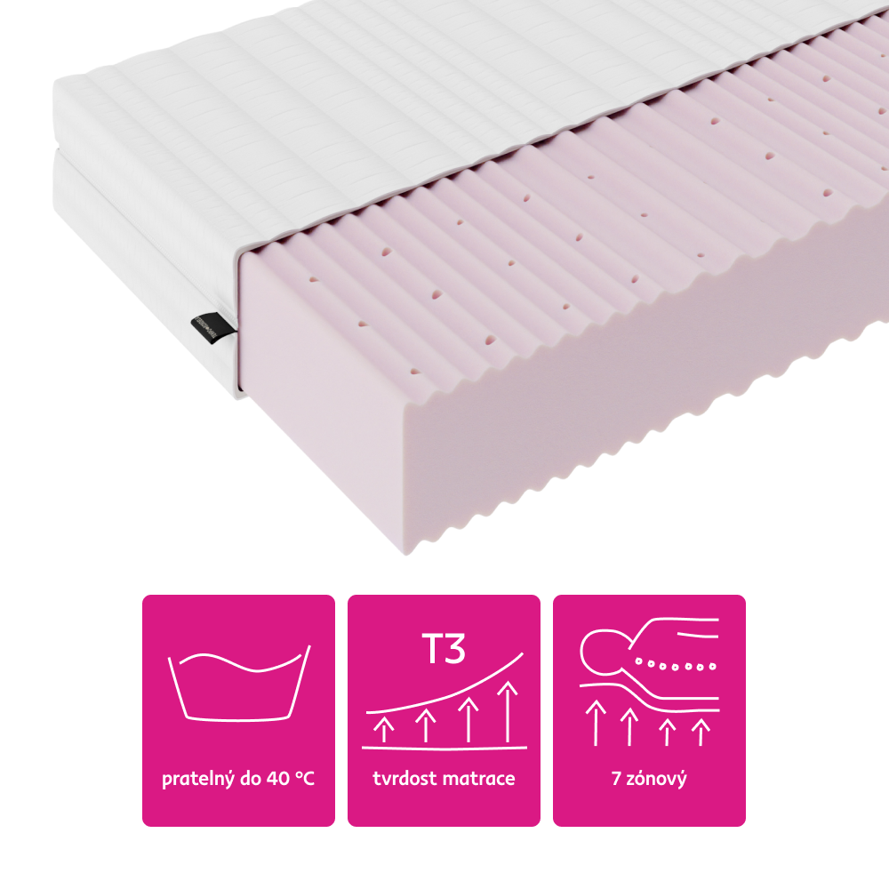 Materiál: PUR pěna/potah Rozměry (ŠxD): 80x200 cm Výška matrace: 14 cm Nosnost na osobu: 100 kg Tvrdost matrace: středně tvrdý H3 Oboustranný Potah s certifikátem OEKO-TEX STANDARD Prošívaný potah Potah OVATA z mikrovlákna 7-zónová profilace Se zipem po celém obvodu Snímatelný Pratelný při teplotě do 40 °C Antibakteriální Antialergický Antiroztočový Perforované jádro matrace poskytuje dostatečné větrání Doporučuje se rošt s mezerami Max. 6 cm