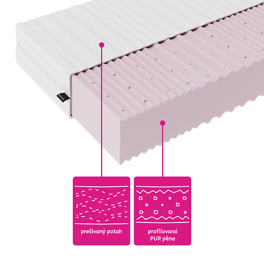 Materiál: PUR pěna/potah Rozměry (ŠxD): 85x200 cm Výška matrace: 14 cm Nosnost na osobu: 100 kg Tvrdost matrace: středně tvrdý H3 Oboustranný Potah s certifikátem OEKO-TEX STANDARD Prošívaný potah Potah OVATA z mikrovlákna 7-zónová profilace Se zipem po celém obvodu Snímatelný Pratelný při teplotě do 40 °C Antibakteriální Antialergický Antiroztočový Perforované jádro matrace poskytuje dostatečné větrání Doporučuje se rošt s mezerami Max. 6 cm