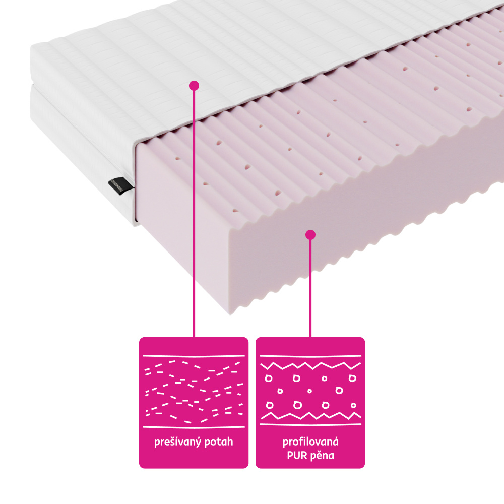 Materiál: PUR pěna/potah Rozměry (ŠxD): 95x200 cm Výška matrace: 14 cm Nosnost na osobu: 100 kg Tvrdost matrace: středně tvrdý H3 Oboustranný Potah s certifikátem OEKO-TEX STANDARD Prošívaný potah Potah OVATA z mikrovlákna 7-zónová profilace Se zipem po celém obvodu Snímatelný Pratelný při teplotě do 40 °C Antibakteriální Antialergický Antiroztočový Perforované jádro matrace poskytuje dostatečné větrání Doporučuje se rošt s mezerami Max. 6 cm