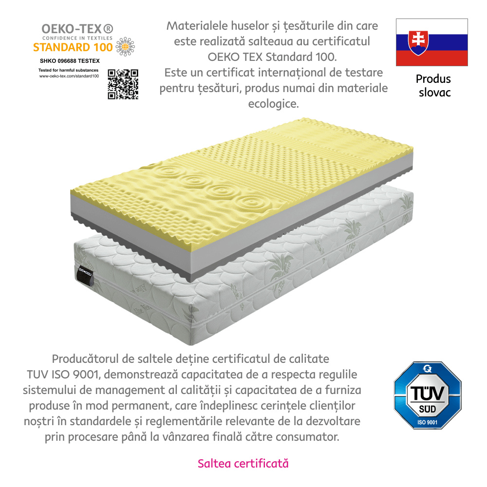 Sendvičová pěnová matrace MATRACE BE TEMPO VISCO Materiál: PUR pěna/paměťová pěna Rozměry (ŠxD): 160x200 cm Výška matrace: 18 cm Tvrdost matrace: středně tvrdý Nosnost: 120 kg Se sedmi zónami. Praní při teplotě 60 ° C. Se zipem. Barva pěny se může lišit Doporučujeme pružný lamelový (předpjaté, pružné lamely) Mezera mezi lamelami Max. 6 cm Tloušťka lamel 0,5-1 cm Kvalitní slovenský výrobek.