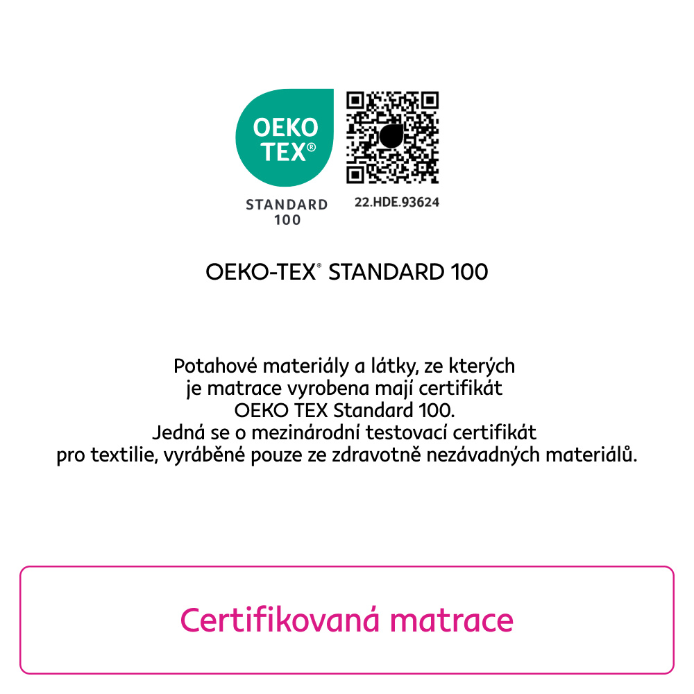 Materiál: studená pěna, polyuretanová pěna/elastická pěna/potah Rozměry (ŠxD): bílá Barevné provedení: 80x195 cm Výška matrace: 18 cm Nosnost na osobu: 110 kg Tvrdost matrací: H3 Oboustranný Potah z výtažků Aloe Vera Potah s certifikátem OEKO-TEX STANDARD Se zipem po celém obvodu Snímatelný Pratelný při teplotě do 40 °C Doporučujeme lamelový rošt Minimální počet lamel 28 Mezera mezi lamelami Max. 6 cm Matrace je vakuově balená, proto po jejím rozbalení ji doporučujeme nechat na rovném podkladu 3-5 dní v klidu, aby zregenerovala na deklarovanou výšku.