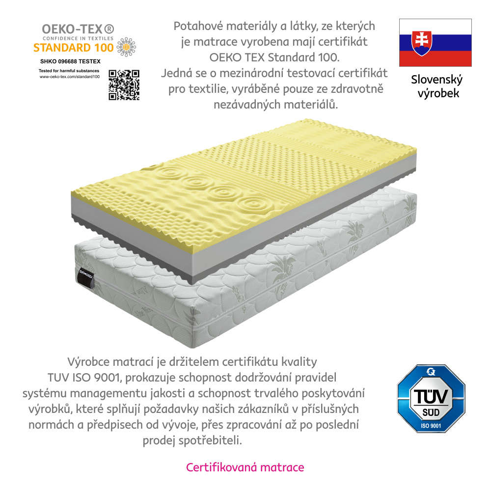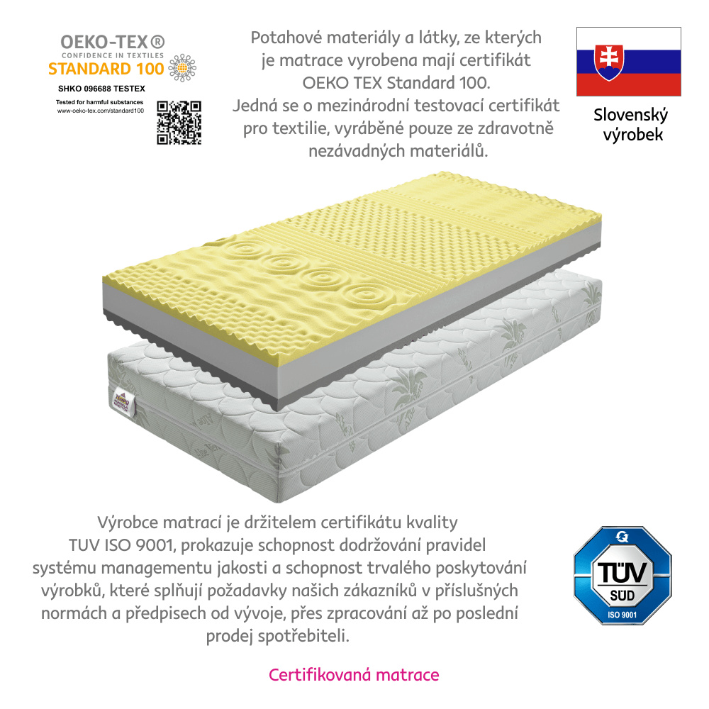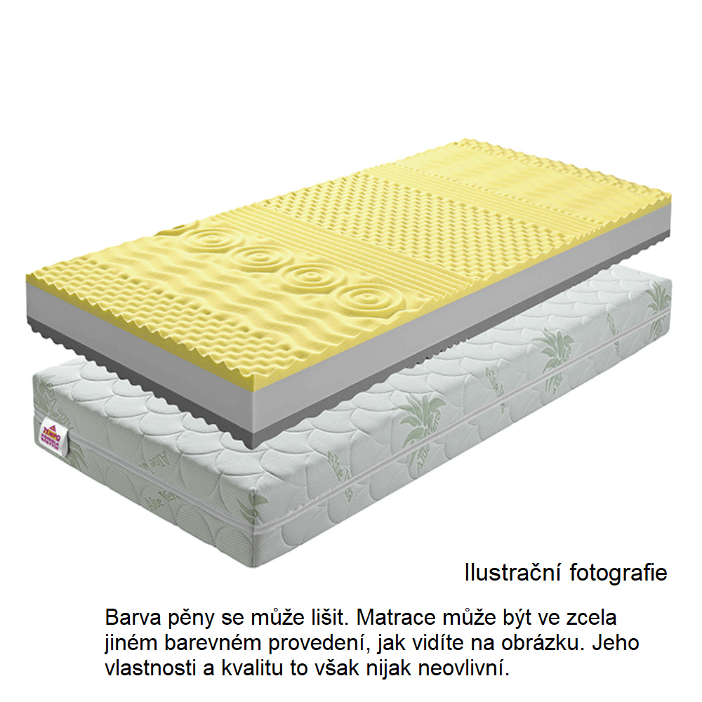 Sendvičová pěnová matrace MATRACE BE TEMPO VISCO Materiál: PUR pěna / paměťová pěna Rozměry (ŠxD): 80x200 cm Výška matrace: 18 cm Tvrdost matrace: středně tvrdý Nosnost: 120 kg Se sedmi zónami. Praní při teplotě 60 ° C. Se zipem. Barva pěny se může lišit Doporučujeme pružný lamelový (předpjaté, pružné lamely) Mezera mezi lamelami Max. 6 cm Tloušťka lamel 0,5-1 cm Kvalitní slovenský výrobek.