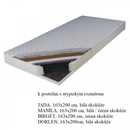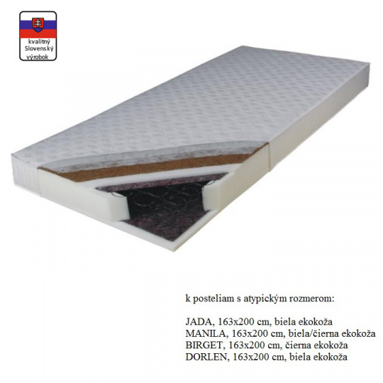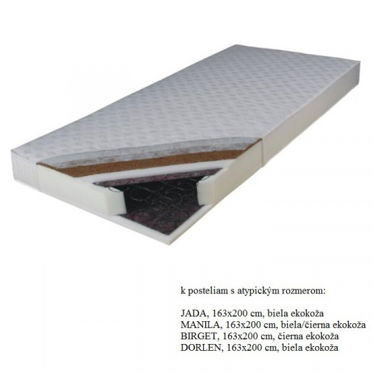 Matrace jednostranný KOKOS MEDIUM ATYP Rozměry (ŠxD): 163x200cm Výška matrace: 16 cm Materiál: Bonelové pružiny / polyuretanová pěna / latexová kokosová deska / bavlněný potah Nosnost: molitanové strany je 80kg a kokosové strany je 100kg. Tvrdost matrace: středně tvrdý T3/tvrdý T4 Matrace je v atypickém rozměru 163x200 cm. Je speciálně vyroben k postelím s takovým vnitřním rozměrem. Matrace doporučujeme k postelím: postel JADA, 160x200 cm, ekokůže bílá postel MANILA, 160x200 cm, ekokůže bílá / černá postel BIRGET, 160x200 cm, ekokůže černá postel DORLEN, 160x200 cm, ekokůže bílá
