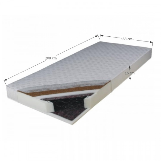 Matrace jednostranný KOKOS MEDIUM ATYP Rozměry (ŠxD): 183x200cm Výška matrace: 16 cm Materiál: Bonelové pružiny / polyuretanová pěna / latexová kokosová deska / bavlněný potah Nosnost: molitanové strany je 80kg a kokosové strany je 100kg. Tvrdost matrace: středně tvrdý T3/tvrdý T4 Matrace je v atypickém rozměru 183x200 cm. Je speciálně vyroben k postelím s takovým vnitřním rozměrem. Matrace doporučujeme k postelím: postel JADA, 180x200 cm, ekokůže bílá postel MANILA, 180x200 cm, ekokůže bílá / černá postel BIRGET, 180x200 cm, ekokůže černá postel DORLEN, 180x200 cm, ekokůže bílá