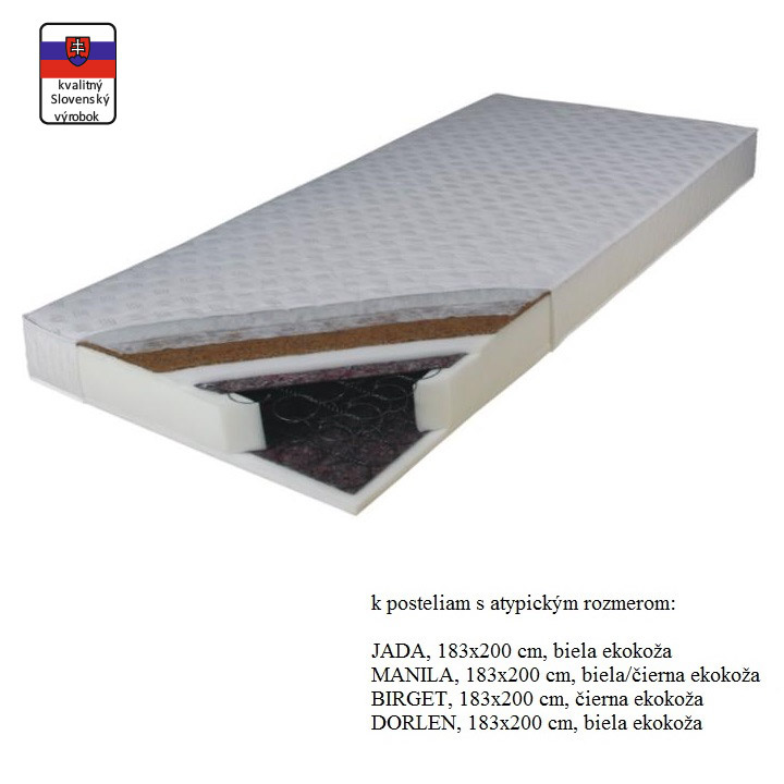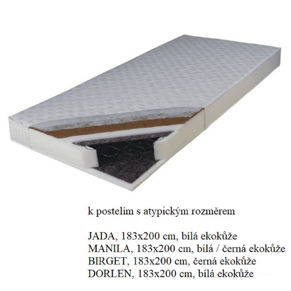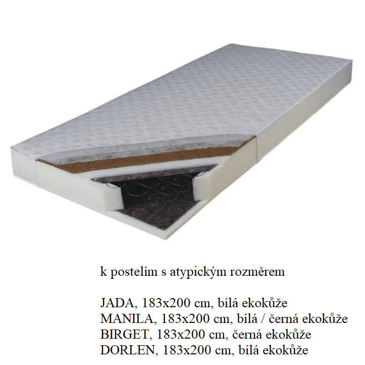 Matrace jednostranný KOKOS MEDIUM ATYP Rozměry (ŠxD): 183x200cm Výška matrace: 16 cm Materiál: Bonelové pružiny / polyuretanová pěna / latexová kokosová deska / bavlněný potah Nosnost: molitanové strany je 80kg a kokosové strany je 100kg. Tvrdost matrace: středně tvrdý T3/tvrdý T4 Matrace je v atypickém rozměru 183x200 cm. Je speciálně vyroben k postelím s takovým vnitřním rozměrem. Matrace doporučujeme k postelím: postel JADA, 180x200 cm, ekokůže bílá postel MANILA, 180x200 cm, ekokůže bílá / černá postel BIRGET, 180x200 cm, ekokůže černá postel DORLEN, 180x200 cm, ekokůže bílá
