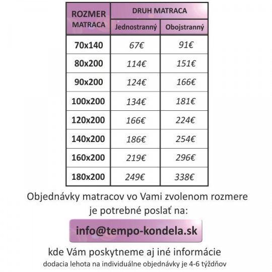 Matrace KOKOS MEDIUM. Rozměry (ŠxD): 80x200 cm Výška matrace: 16 cm Materiál: Bonelové pružiny / polyuretanová pěna / latexová kokosová deska / bavlněný potah Nosnost: molitanové strany je 80 kg a kokosové strany 100 kg. Hmotnost: 12 kg Tvrdost matrace: středně tvrdý T3/tvrdý T4