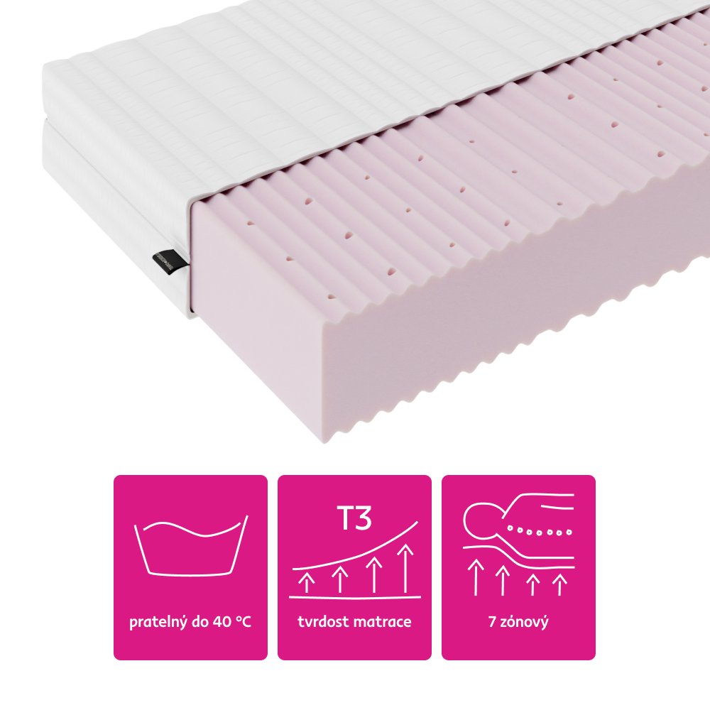 Materiál: PUR pěna/potah Rozměry (ŠxD): 160x200 cm Výška matrace: 14 cm Nosnost na osobu: 100 kg Tvrdost matrace: středně tvrdý H3 Oboustranný Potah s certifikátem OEKO-TEX STANDARD Prošívaný potah Potah OVATA z mikrovlákna 7-zónová profilace Se zipem po celém obvodu Snímatelný Pratelný při teplotě do 40 °C Antibakteriální Antialergický Antiroztočový Perforované jádro matrace poskytuje dostatečné větrání Doporučuje se rošt s mezerami Max. 6 cm Rolovaný a vakuově balený Barva pěny a prošívání potahu matrace se mohou mírně lišit od vyobrazení. Tyto vizuální rozdíly nemají žádný vliv na funkční vlastnosti, komfort ani kvalitu matrace. Matrace je vakuově balená a rolovaná, proto ji po jejím rozbalení doporučujeme ponechat na rovném podkladu 24-48 hodin v klidu (nepoužívat a nezatěžovat), aby zregenerovala na deklarovanou výšku. Rolovanou matraci po převzetí zásílky prodleně rozbalte a nechte volně rozvinout nejpozději do 48 hodin od doručení.