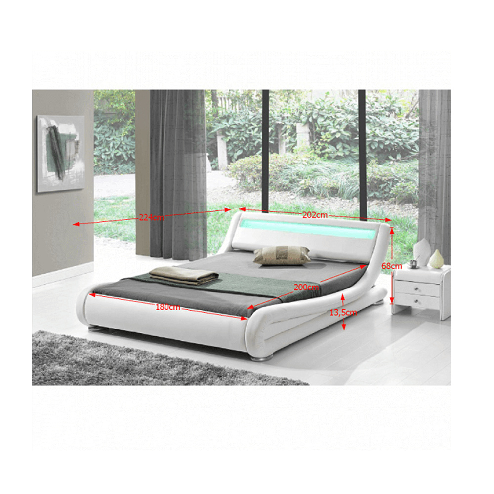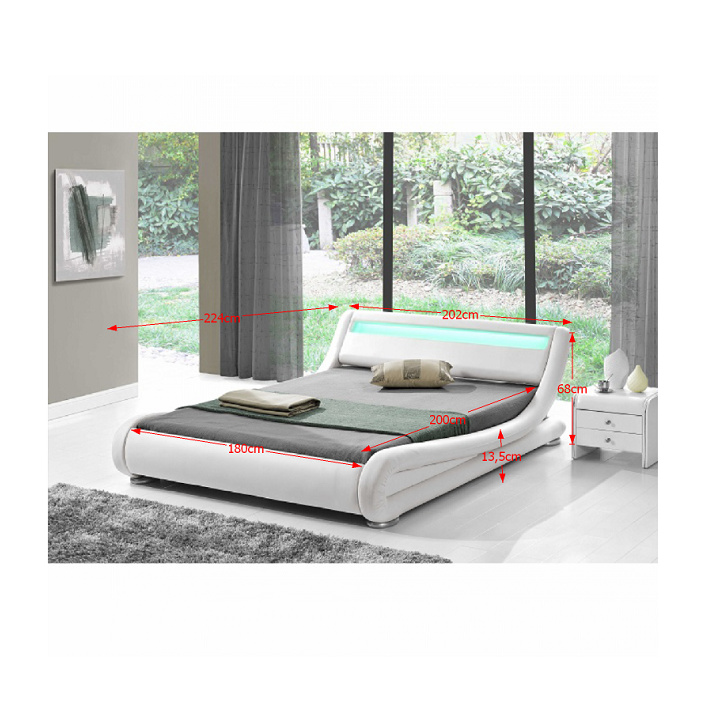 Moderní postel s lamelovým roštem a RGB LED osvětlením v čele Materiál: ekokůže Oděruodolnost textilie podle testu Martindale: 100 000 oděrek Rozměry (ŠxHxV): 202x224x68 cm, plocha na spaní (ŠxD): 180x200 cm Výška postele po rošt: 13,5 cm, Doporučená výška matrace: 22-25 cm Nosnost: 110 kg K posteli doporučujeme zakoupit matraci o rozměru 180x200 cm na základě naší nabídky.