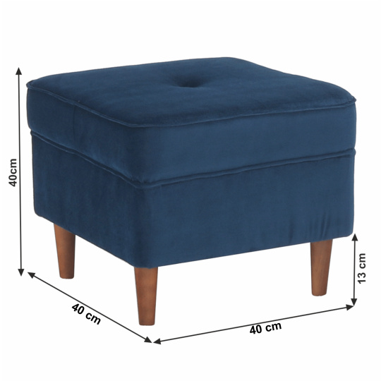 Moderní taburet RUFINO 3 NEW Materiál: látka Kronos 9 / dřevo Oděruodolnost textilie podle testu Martindale: 50 000 oděrek Barva: modrá / ořech Rozměry: (ŠxHxV): 40x40x40 cm Výška nožiček: 13 cm Výška spodního prostoru od podlahy: 13 cm Nosnost na osobu: 110 kg Barva nožiček se může lišit. Dodávané v demontu.
