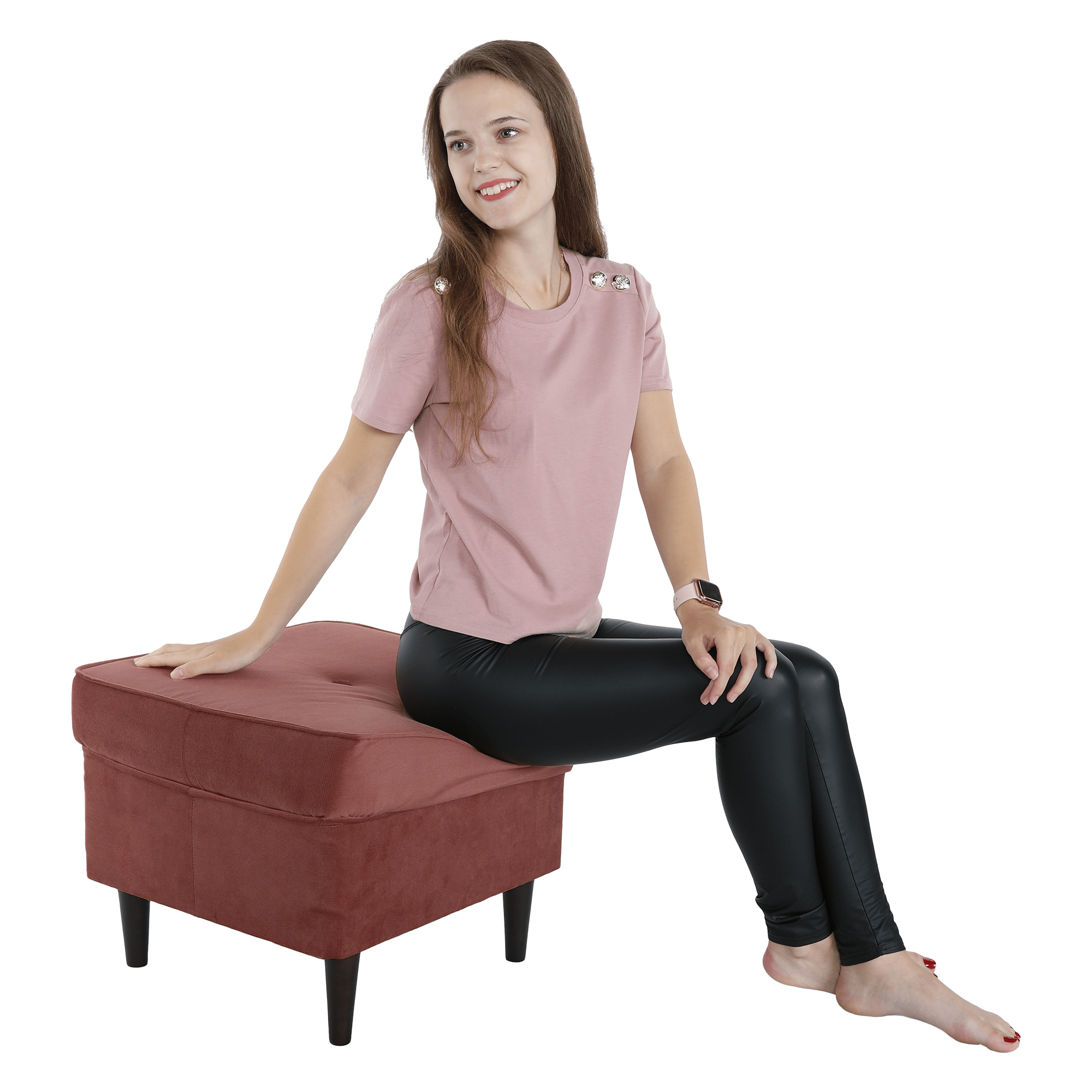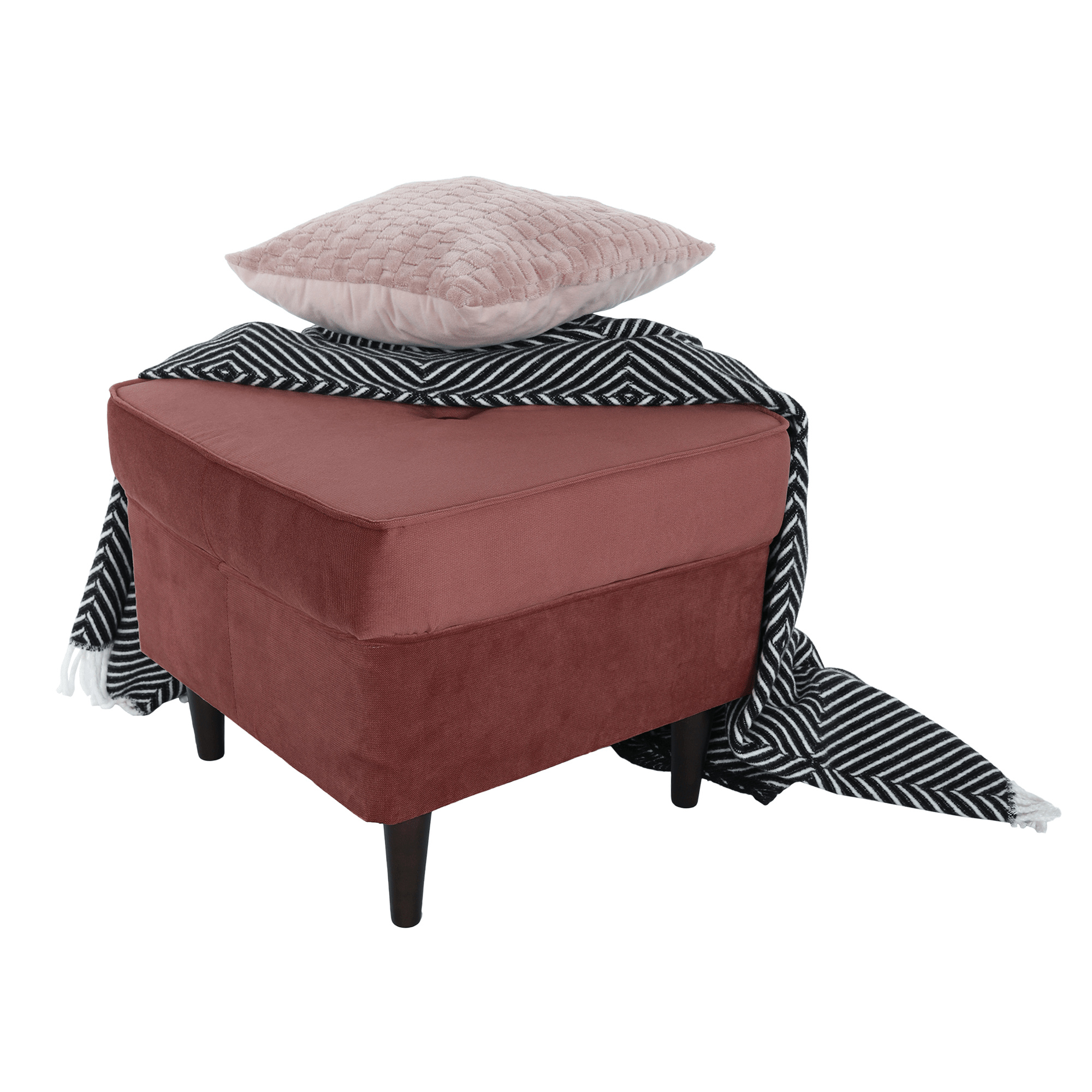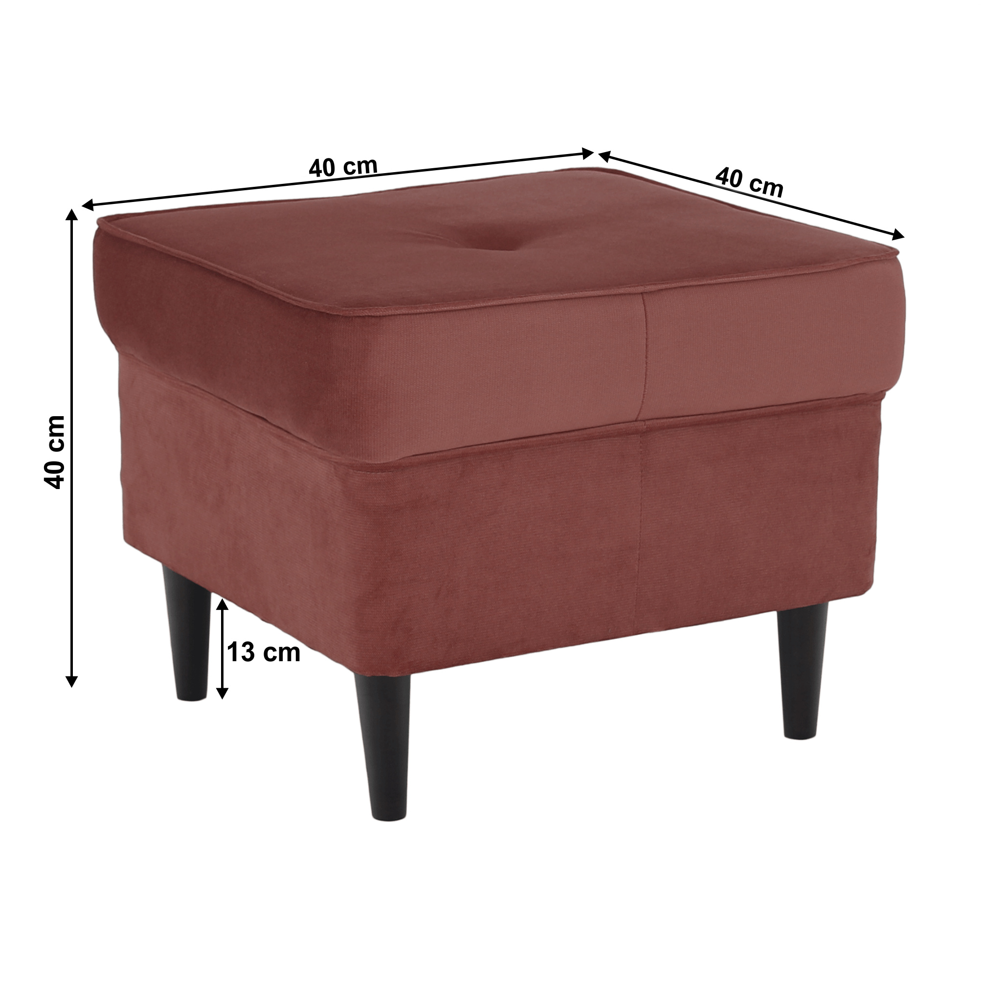 Moderní taburet RUFINO 3 NEW Materiál: látka Kronos 29 / dřevo Oděruodolnost textilie podle testu Martindale: 50 000 oděrek Barva: starorůžová / ořech Rozměry: (ŠxHxV): 40x40x40 cm Výška nožiček: 13 cm Výška spodního prostoru od podlahy: 13 cm Nosnost na osobu: 110 kg Barva nožiček se může lišit. Dodávané v demontu.