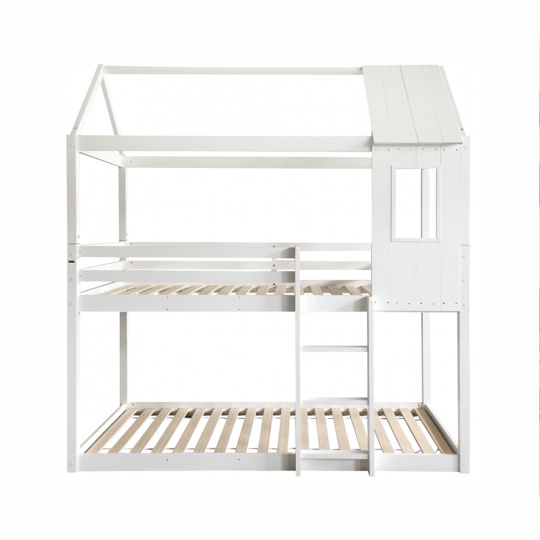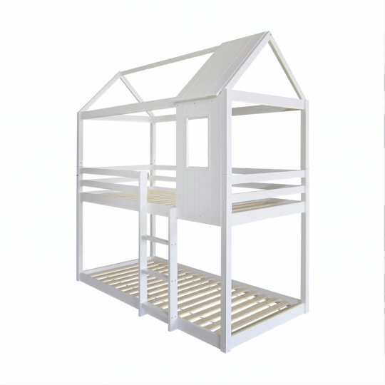 Materiál: borové dřevo/překližka Barva: bílá Rozměry (ŠxHxV): 211x97x207 cm Plocha na spaní (ŠxD): 90x200 cm Tloušťka materiálu: 2 cm Výška mezi spodním a horním lůžkem: 124 cm Postel ve tvaru domečku Nosnost na horní lůžko: 90 kg Nosnost na spodní lůžko: 95 kg Na nožičkách Výška nožiček: 21 cm Dva šuplíky Rozměr šuplíku (ŠxV): 93x17 cm S