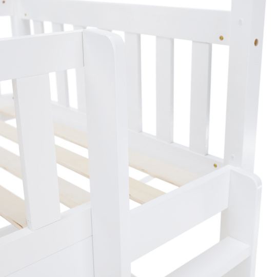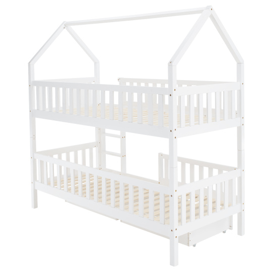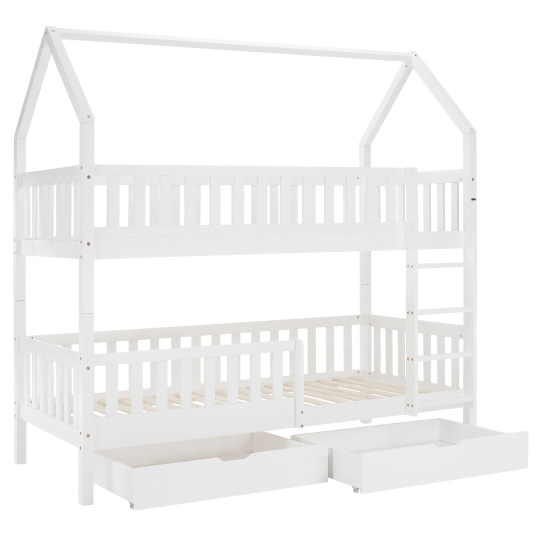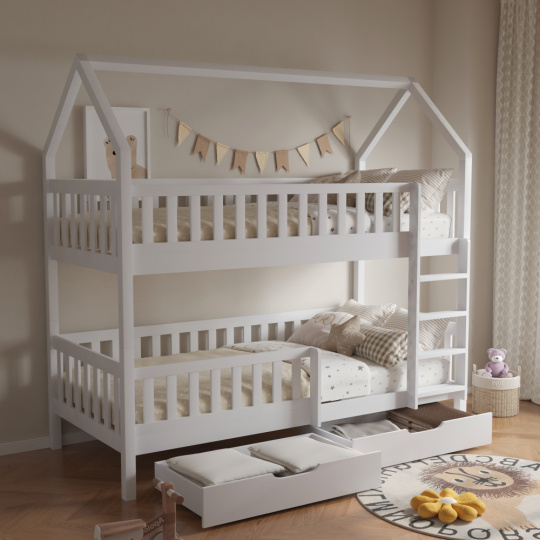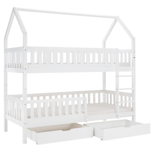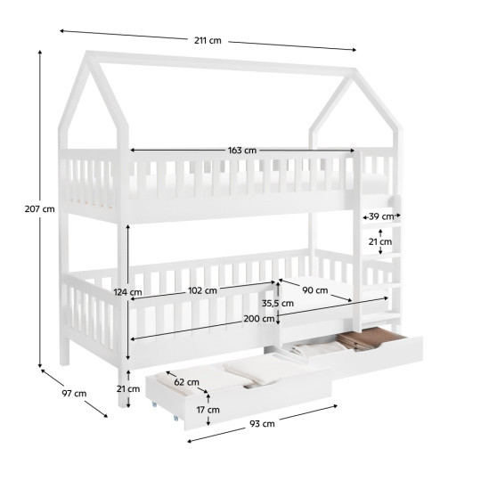 Materiál: borové dřevo/překližka Barva: bílá Rozměry (ŠxHxV): 211x97x207 cm Plocha na spaní (ŠxD): 90x200 cm Tloušťka materiálu: 2 cm Výška mezi spodním a horním lůžkem: 124 cm Postel ve tvaru domečku Nosnost na horní lůžko: 90 kg Nosnost na spodní lůžko: 95 kg Na nožičkách Výška nožiček: 21 cm Dva šuplíky Rozměr šuplíku (ŠxV): 93x17 cm S žebříkem S bezpečnostní bariérou Možnost namontovat zábranu a žebřík na levou nebo pravou stranu Dodávána bez matrace Možnost zakoupit pružinovou matraci z naší nabídky Doporučená výška matrace na horní lůžko: Max. 14 cm Doporučená výška matrace na spodní lůžko: max. 18 cm Dodávána s překližkovými rolovanými rošty Rozložitelná na dvě lůžka Dodáváno v demontu