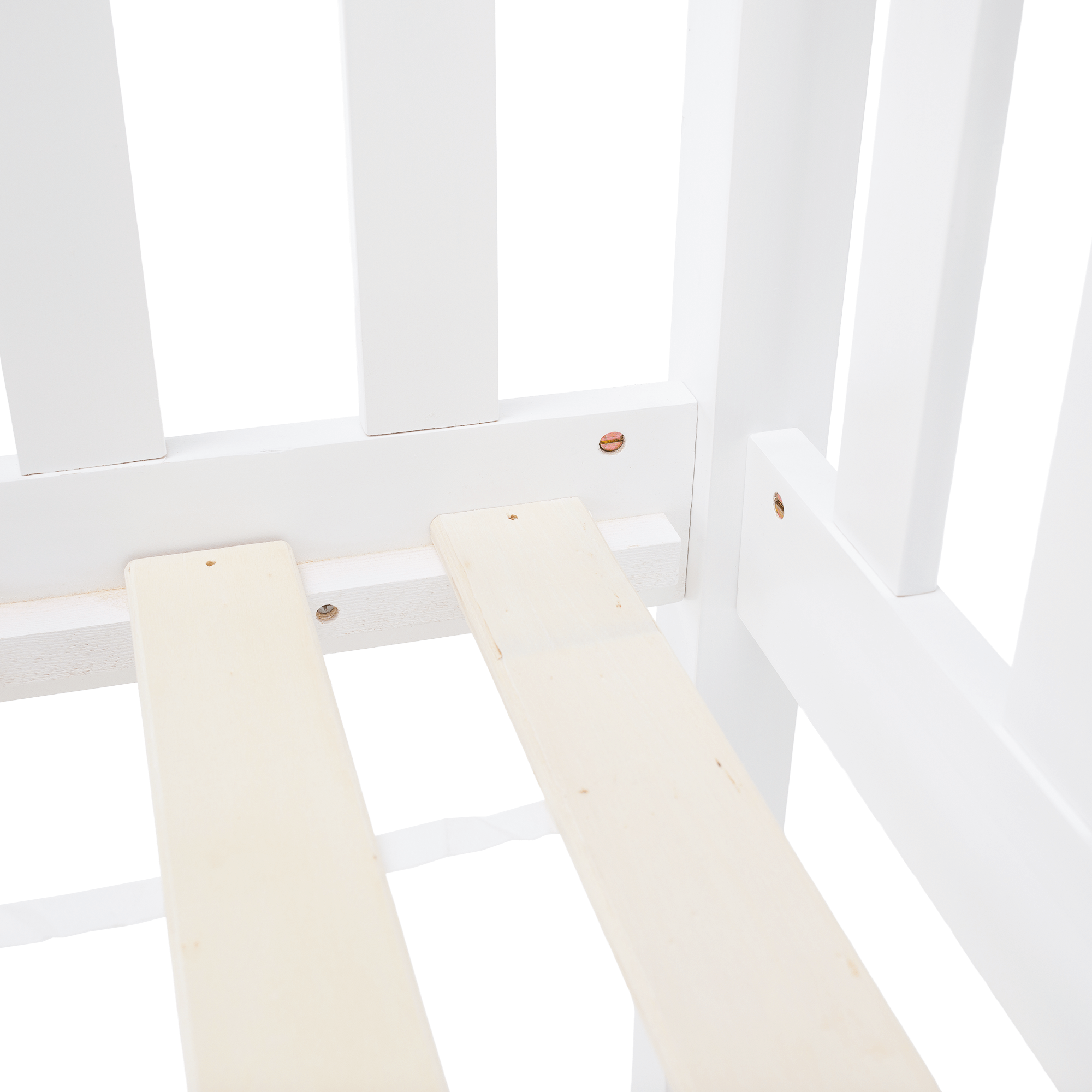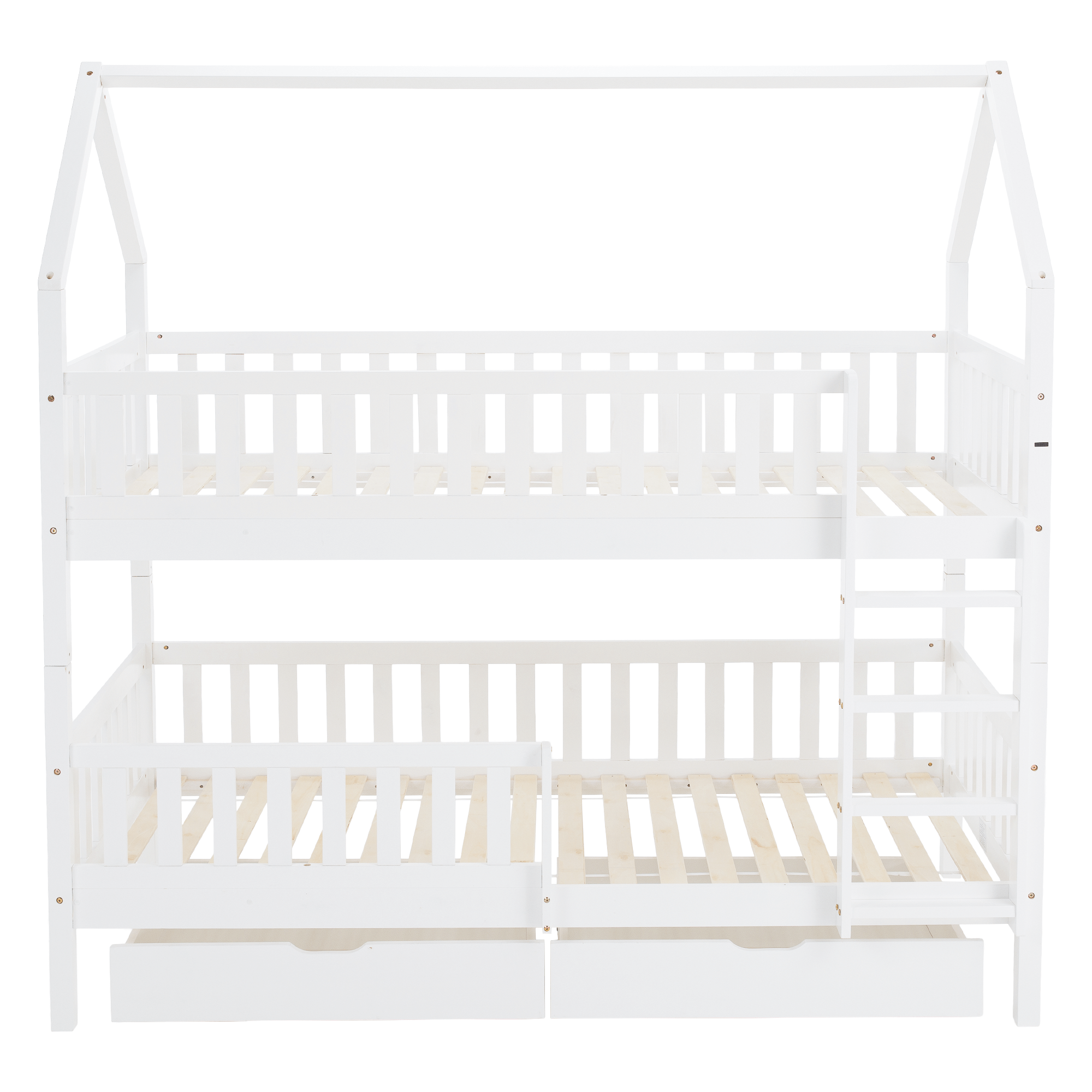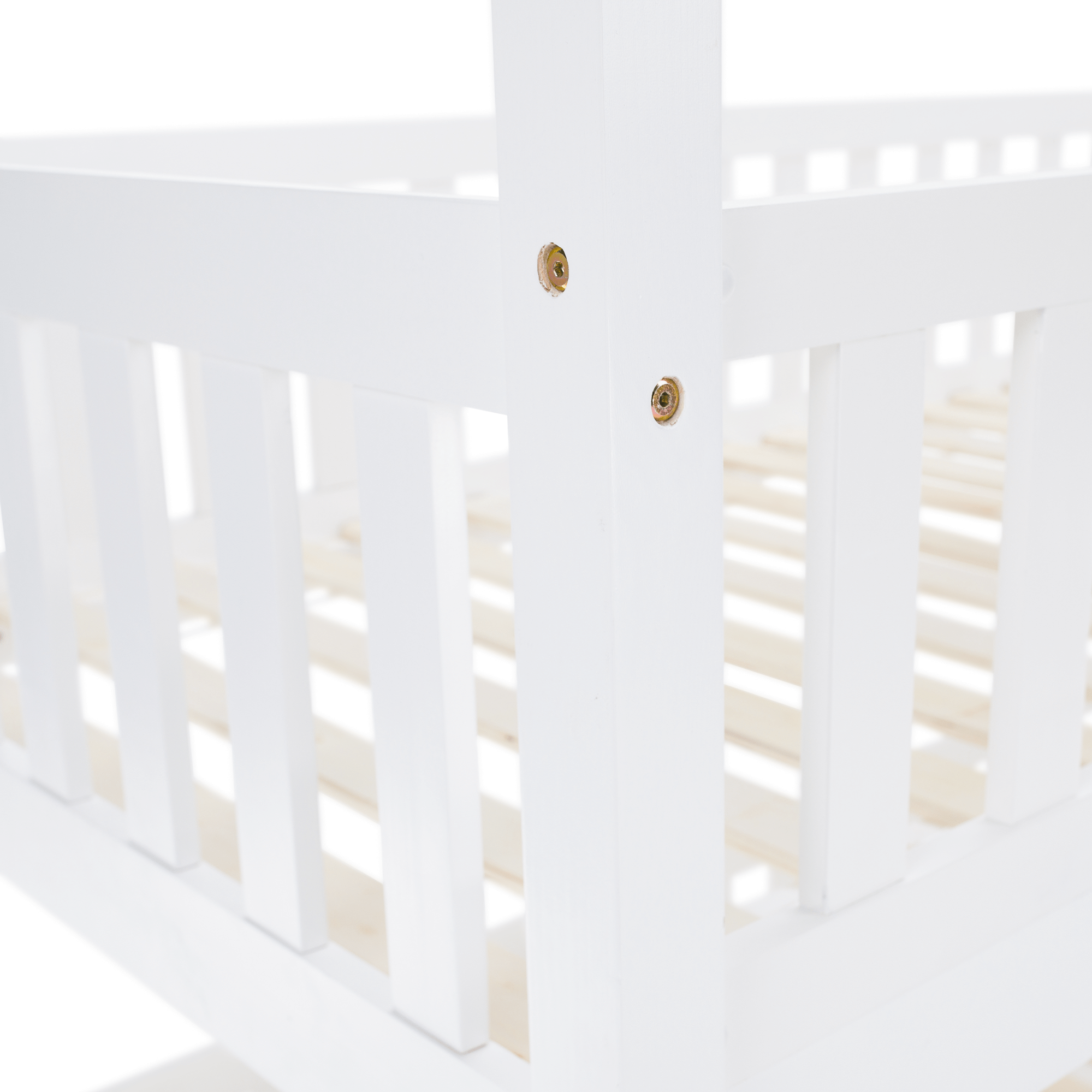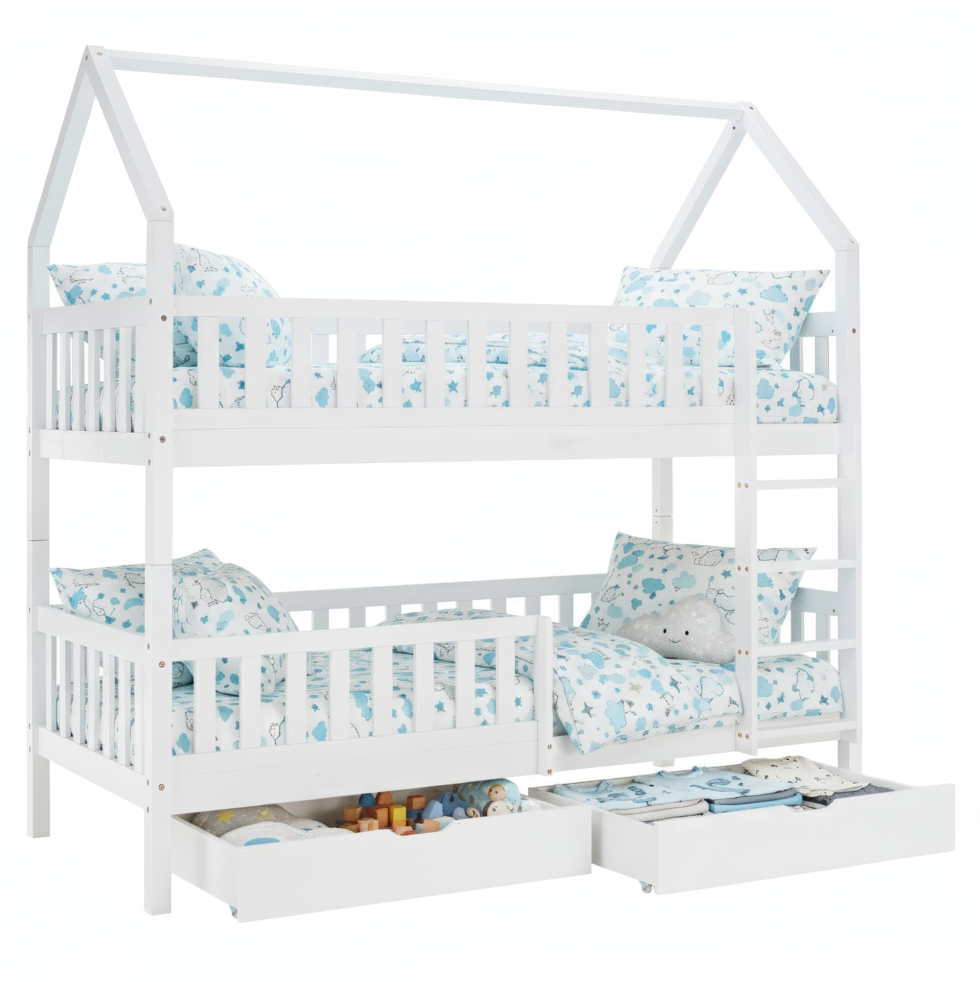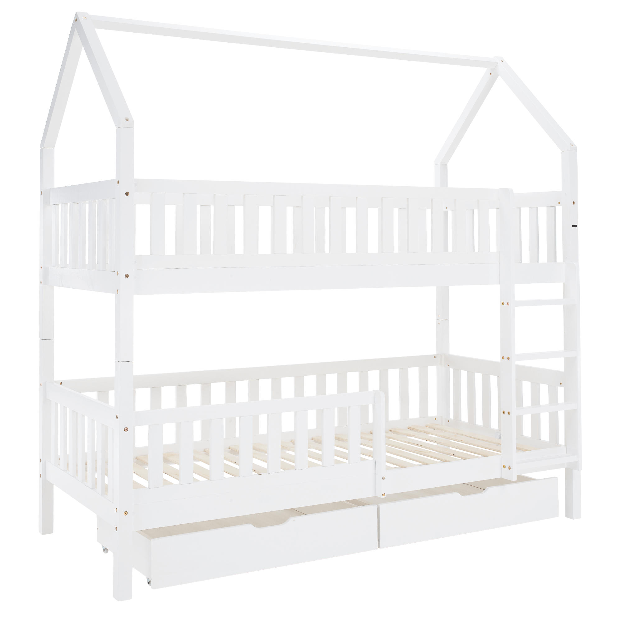 Materiál: borové dřevo/překližka Barva: bílá Rozměry (ŠxHxV): 211x97x207 cm Plocha na spaní (ŠxD): 90x200 cm Tloušťka materiálu: 2 cm Výška mezi spodním a horním lůžkem: 124 cm Postel ve tvaru domečku Nosnost na horní lůžko: 90 kg Nosnost na spodní lůžko: 95 kg Na nožičkách Výška nožiček: 21 cm Dva šuplíky Rozměr šuplíku (ŠxV): 93x17 cm S žebříkem S bezpečnostní bariérou Možnost namontovat zábranu a žebřík na levou nebo pravou stranu Dodávána bez matrace Možnost zakoupit pružinovou matraci z naší nabídky Doporučená výška matrace na horní lůžko: Max. 14 cm Doporučená výška matrace na spodní lůžko: max. 18 cm Dodávána s překližkovými rolovanými rošty Rozložitelná na dvě lůžka Dodáváno v demontu