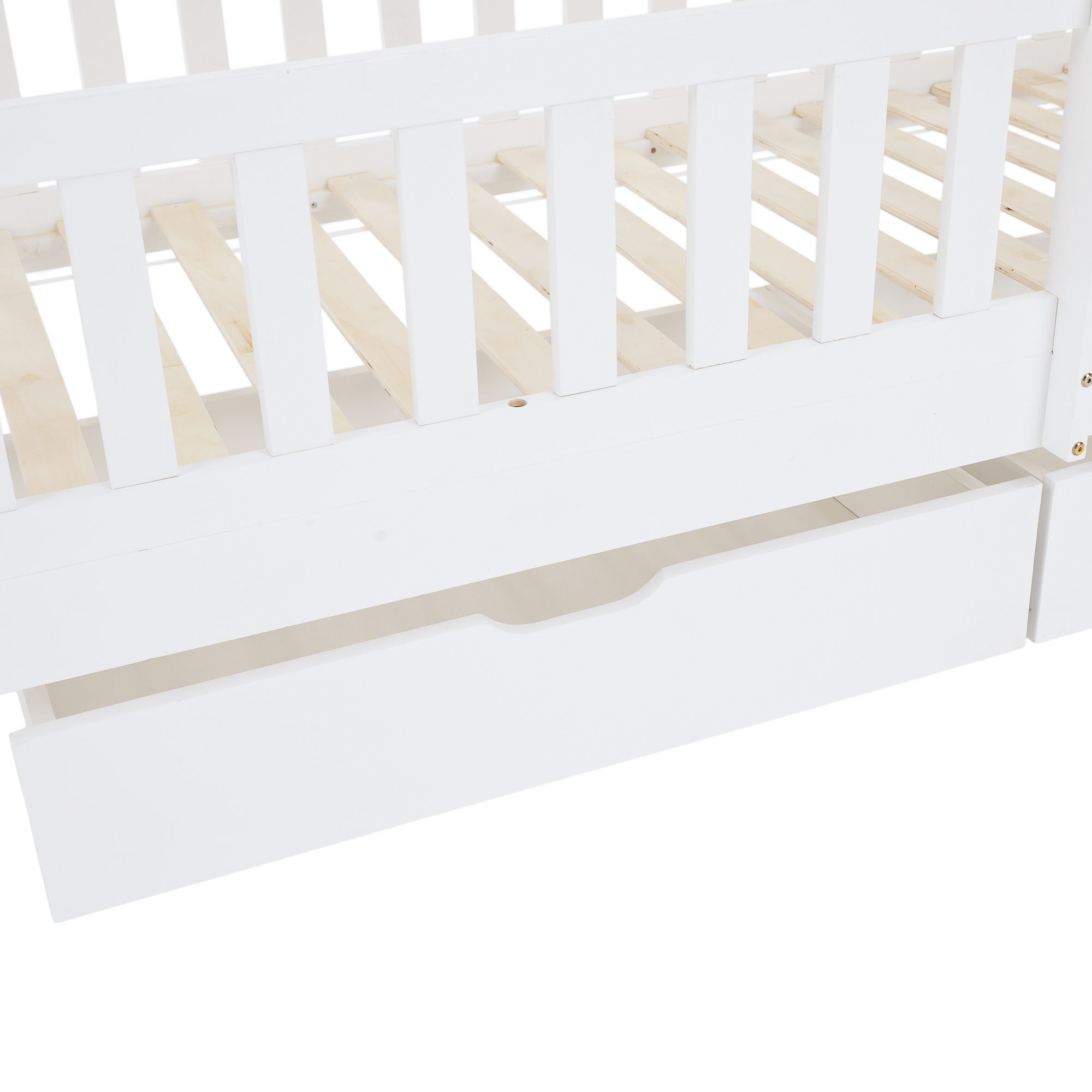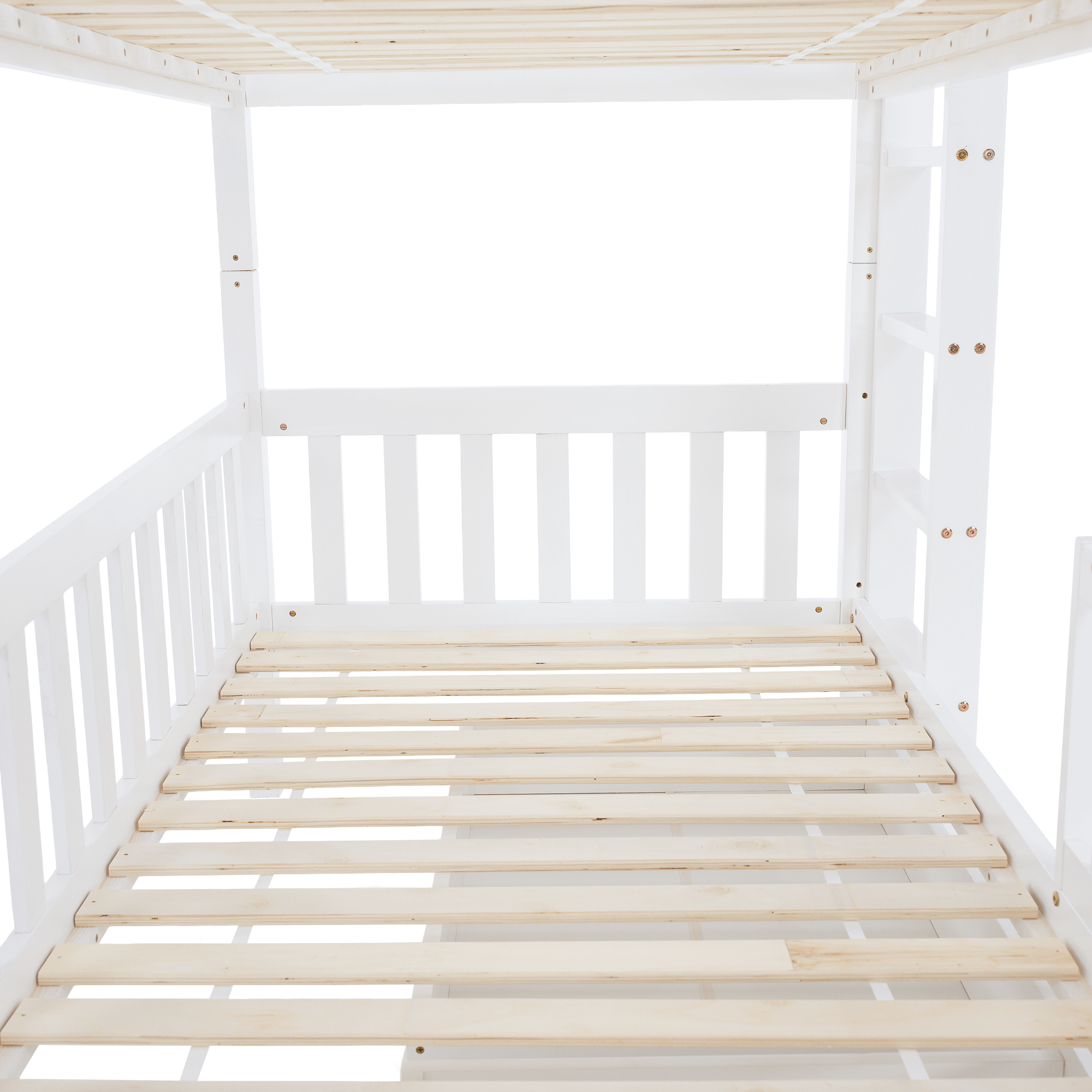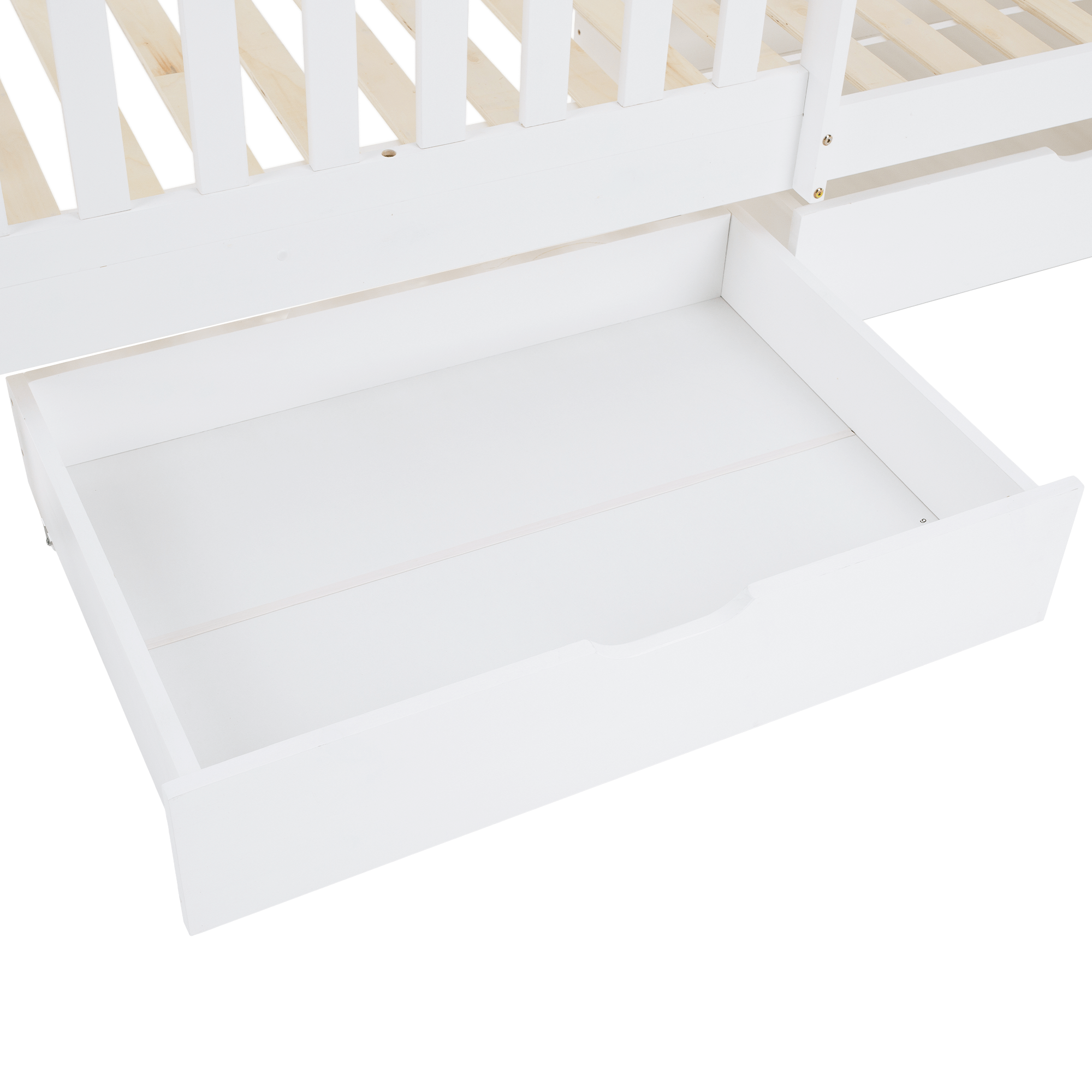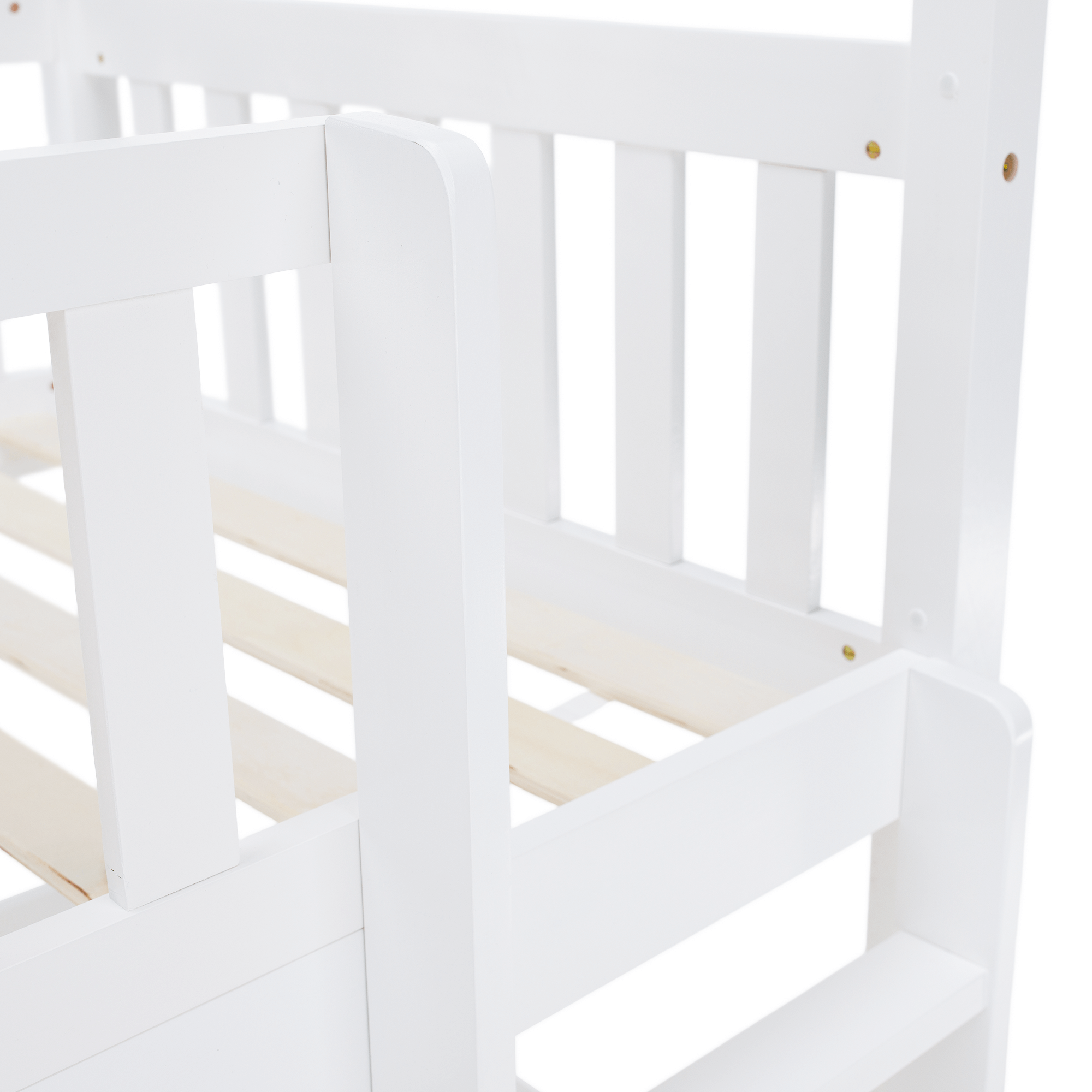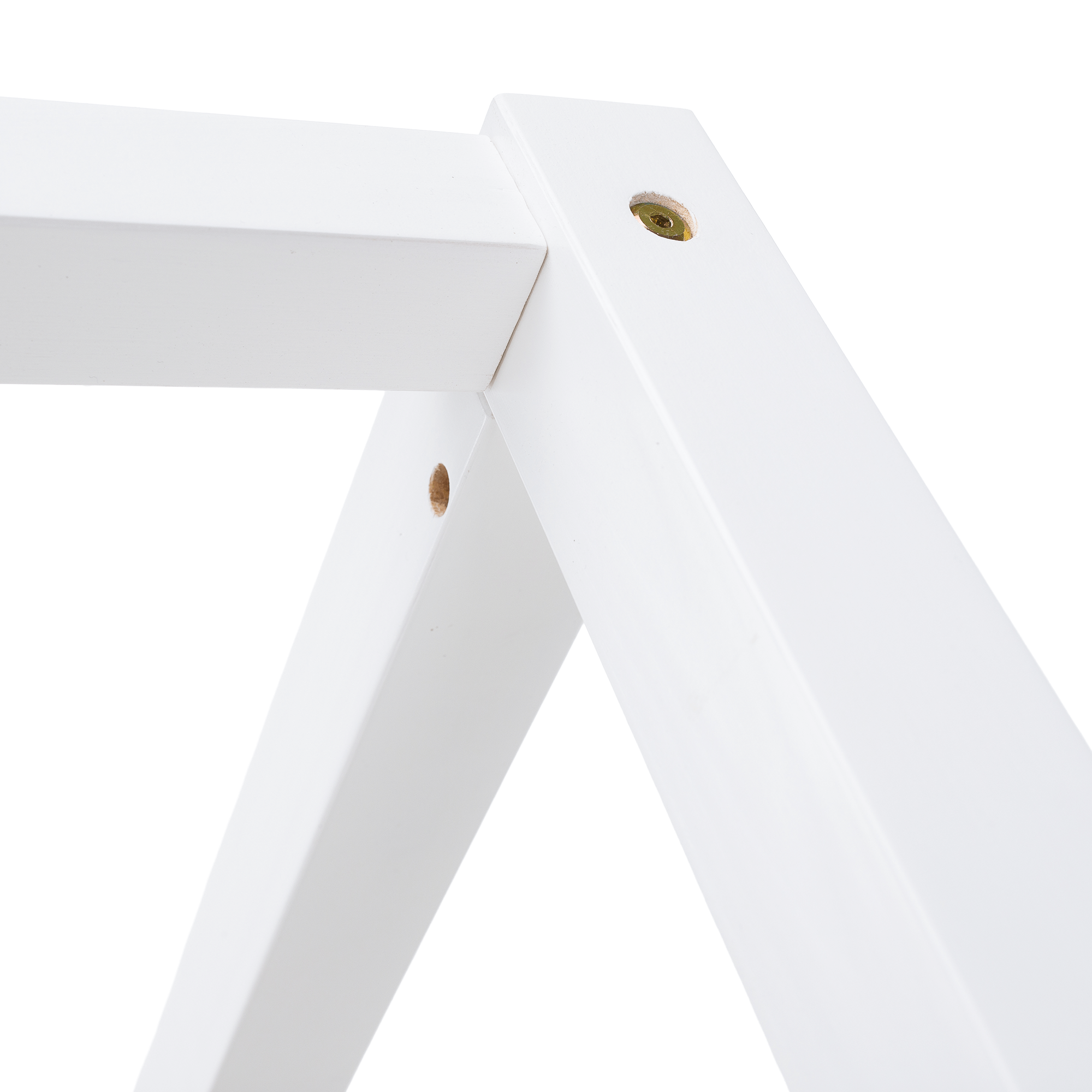 Materiál: borové dřevo/překližka Barva: bílá Rozměry (ŠxHxV): 211x97x207 cm Plocha na spaní (ŠxD): 90x200 cm Tloušťka materiálu: 2 cm Výška mezi spodním a horním lůžkem: 124 cm Postel ve tvaru domečku Nosnost na horní lůžko: 90 kg Nosnost na spodní lůžko: 95 kg Na nožičkách Výška nožiček: 21 cm Dva šuplíky Rozměr šuplíku (ŠxV): 93x17 cm S žebříkem S bezpečnostní bariérou Možnost namontovat zábranu a žebřík na levou nebo pravou stranu Dodávána bez matrace Možnost zakoupit pružinovou matraci z naší nabídky Doporučená výška matrace na horní lůžko: Max. 14 cm Doporučená výška matrace na spodní lůžko: max. 18 cm Dodávána s překližkovými rolovanými rošty Rozložitelná na dvě lůžka Dodáváno v demontu