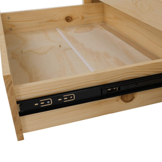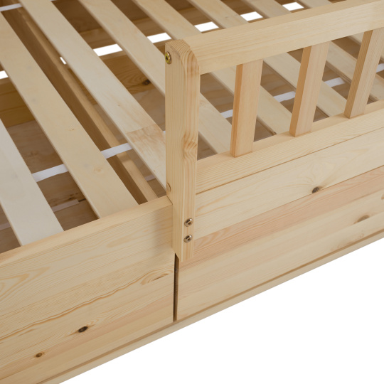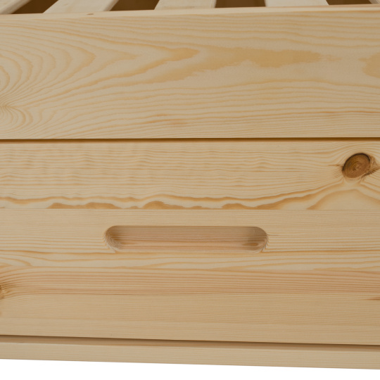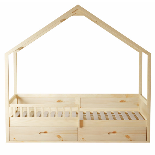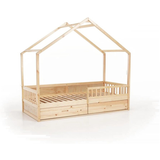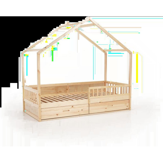 Materiál: masiv borovice Barva: přírodní Rozměry (ŠxHxV): 207x97x187 cm Plocha na spaní (ŠxD): 90x200 cm Tloušťka materiálu: 2 cm Výška po rošt: 27 cm Nosnost: 95 kg Úložný prostor Dva šuplíky Rozměr šuplíku (ŠxHxV): 99x62x21,5 cm Nosnost šuplíku: 10 kg Možnost namontovat zábranu na levou nebo pravou stranu Výška zábrany: 31,5 cm Postel ve tvaru domečku Dodávána s překližkovým rolovaným roštem Dodávána bez matrace Možnost zakoupit pružinovou matraci z naší nabídky Doporučená maximální výška matrace: 12 cm Dodáváno v demontu