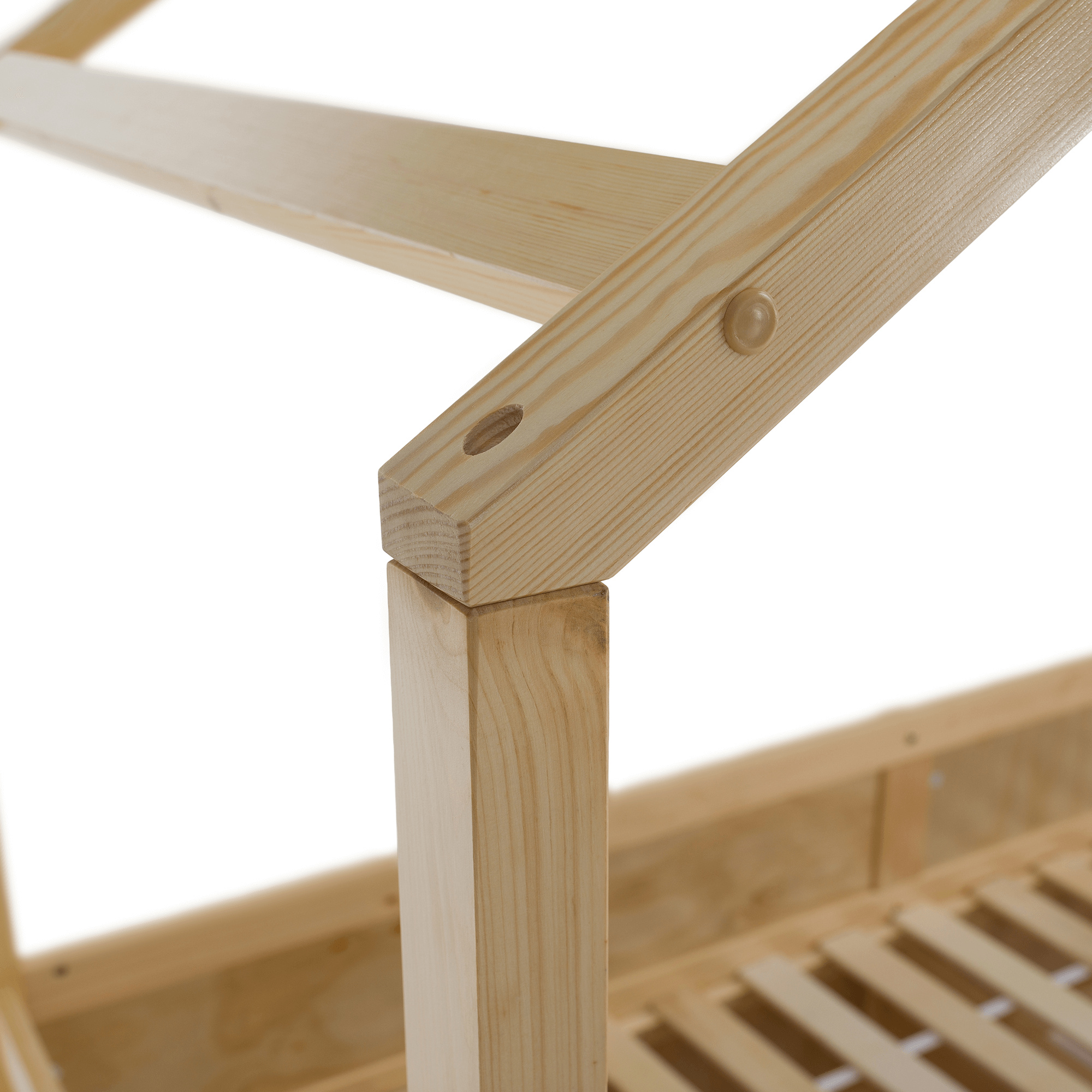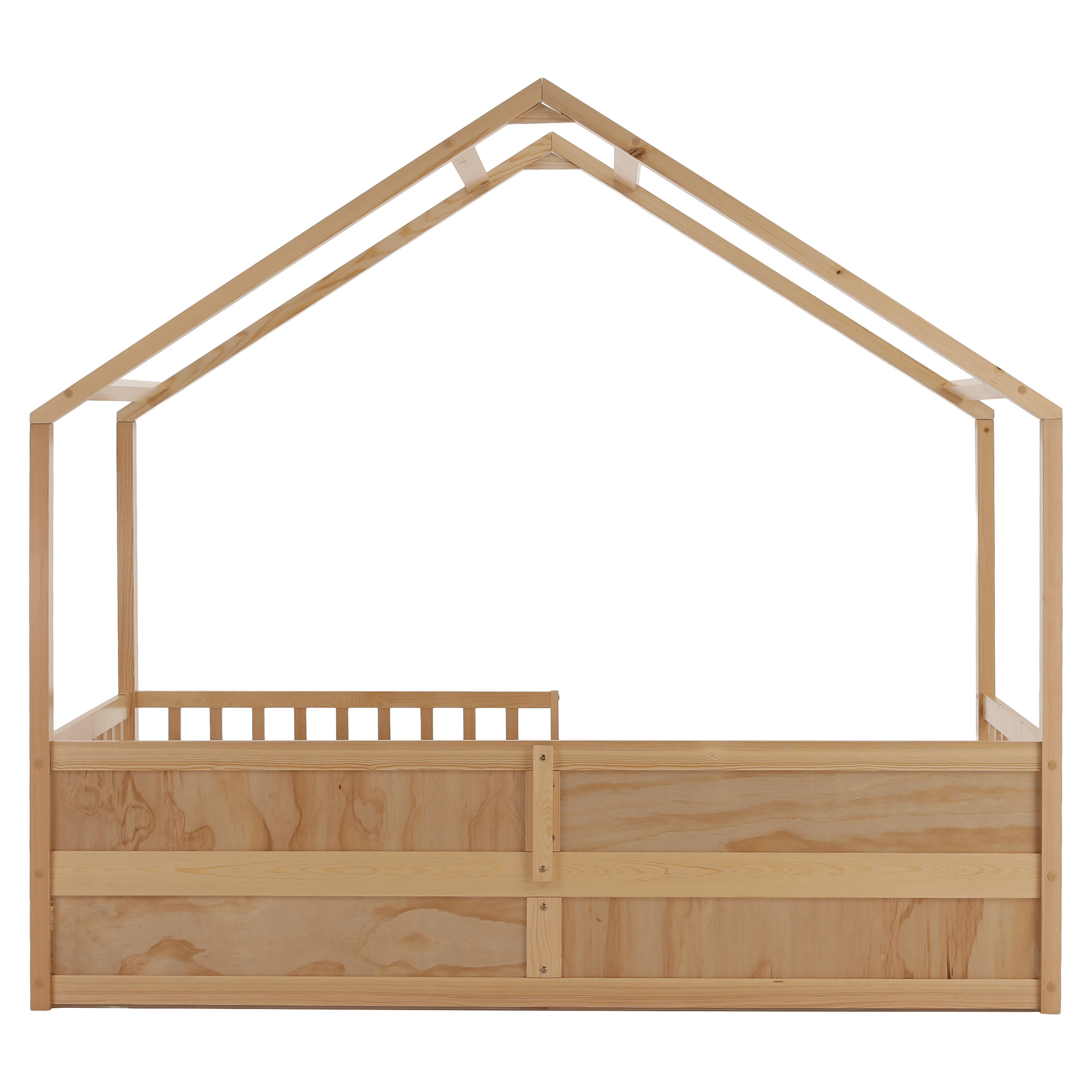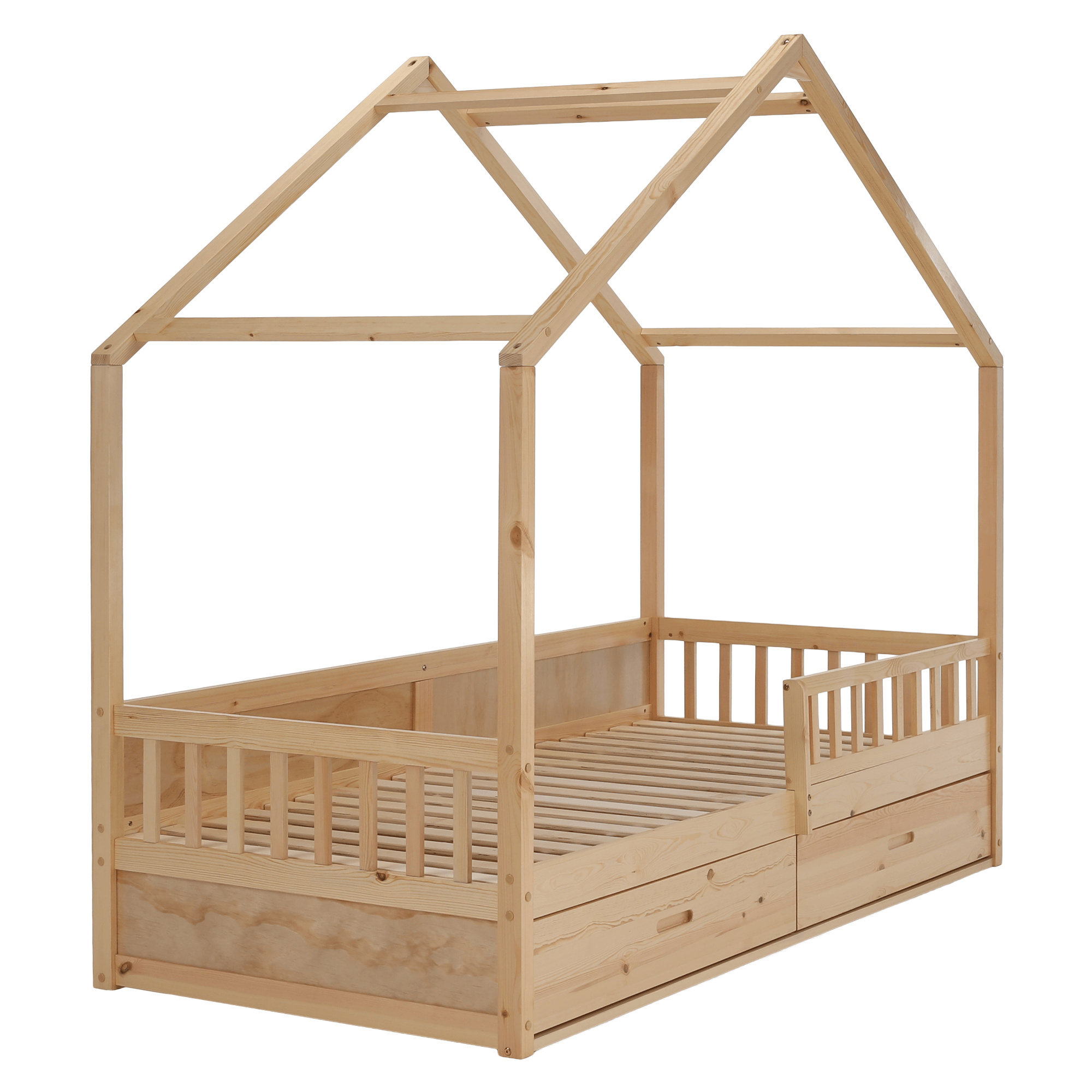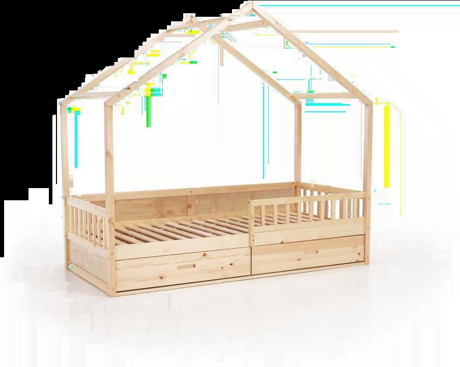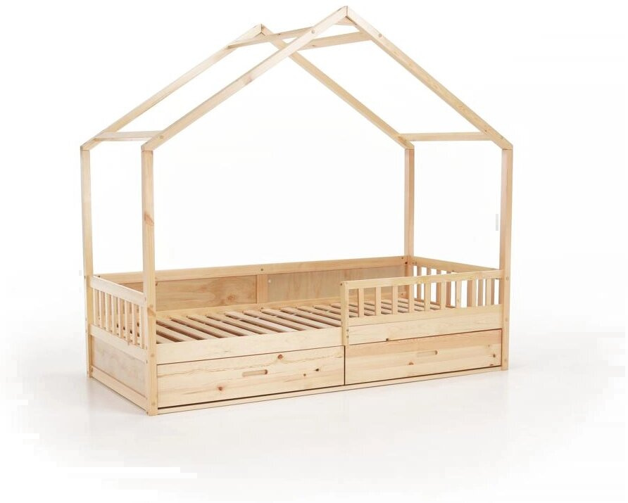 Materiál: masiv borovice Barva: přírodní Rozměry (ŠxHxV): 207x97x187 cm Plocha na spaní (ŠxD): 90x200 cm Tloušťka materiálu: 2 cm Výška po rošt: 27 cm Nosnost: 95 kg Úložný prostor Dva šuplíky Rozměr šuplíku (ŠxHxV): 99x62x21,5 cm Nosnost šuplíku: 10 kg Možnost namontovat zábranu na levou nebo pravou stranu Výška zábrany: 31,5 cm Postel ve tvaru domečku Dodávána s překližkovým rolovaným roštem Dodávána bez matrace Možnost zakoupit pružinovou matraci z naší nabídky Doporučená maximální výška matrace: 12 cm Dodáváno v demontu