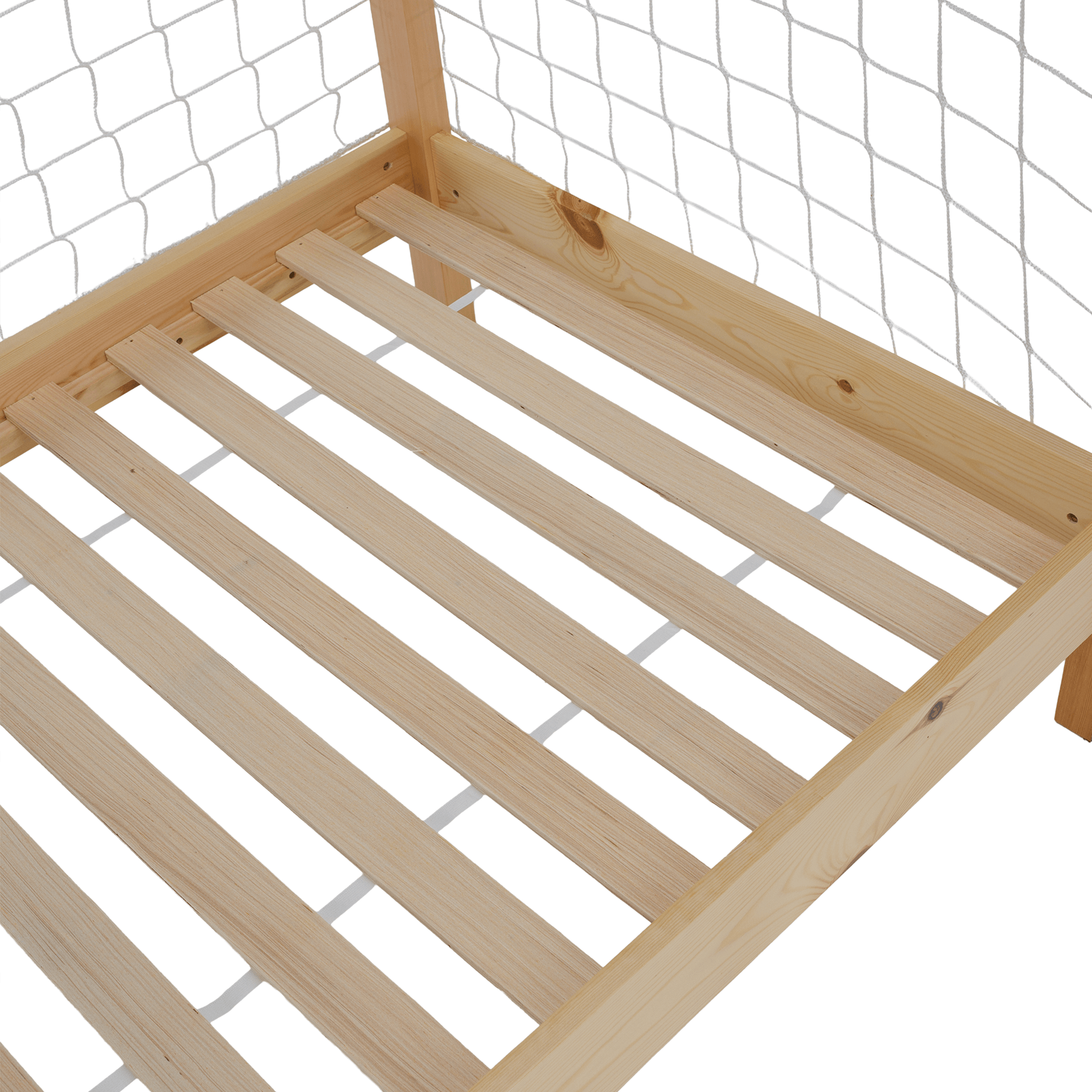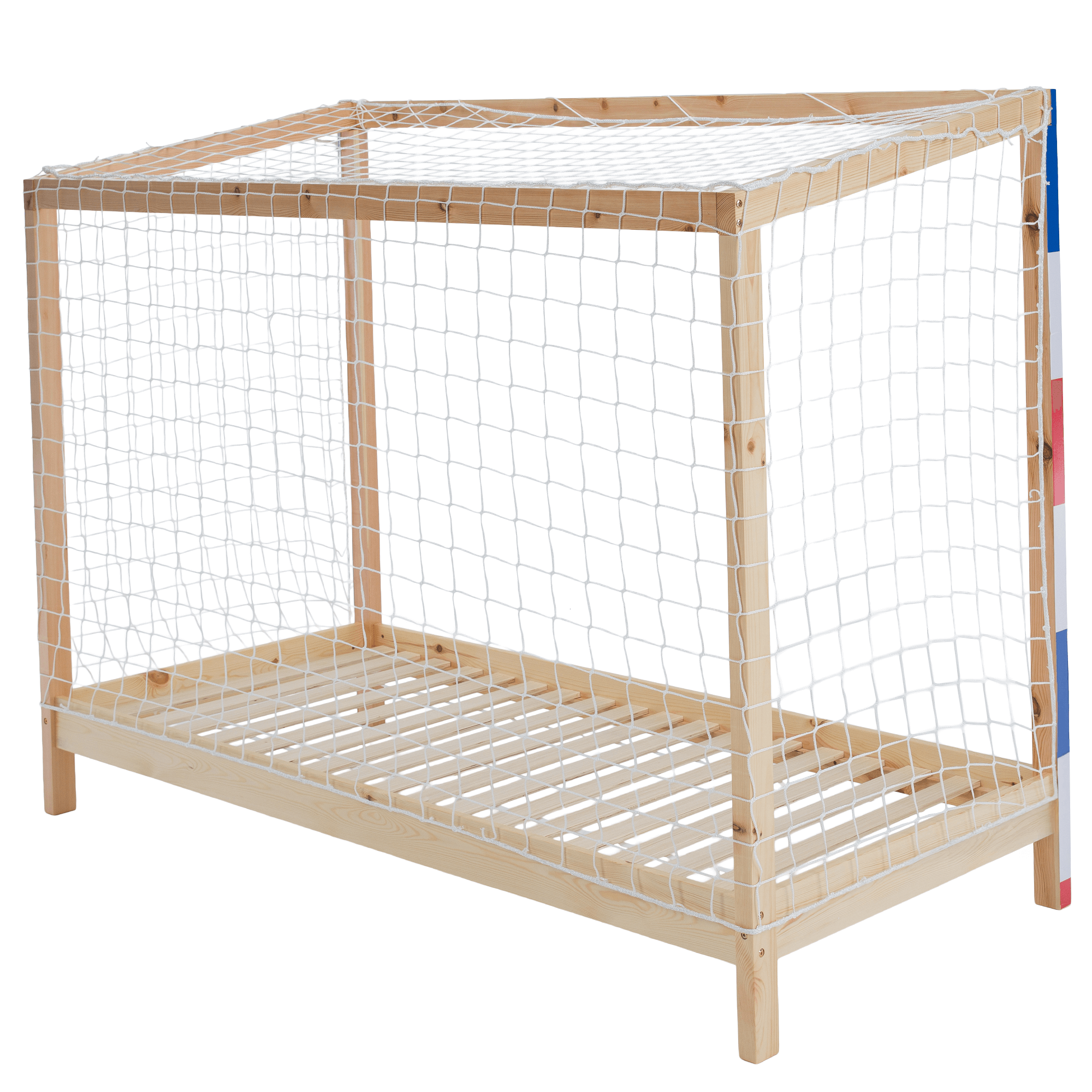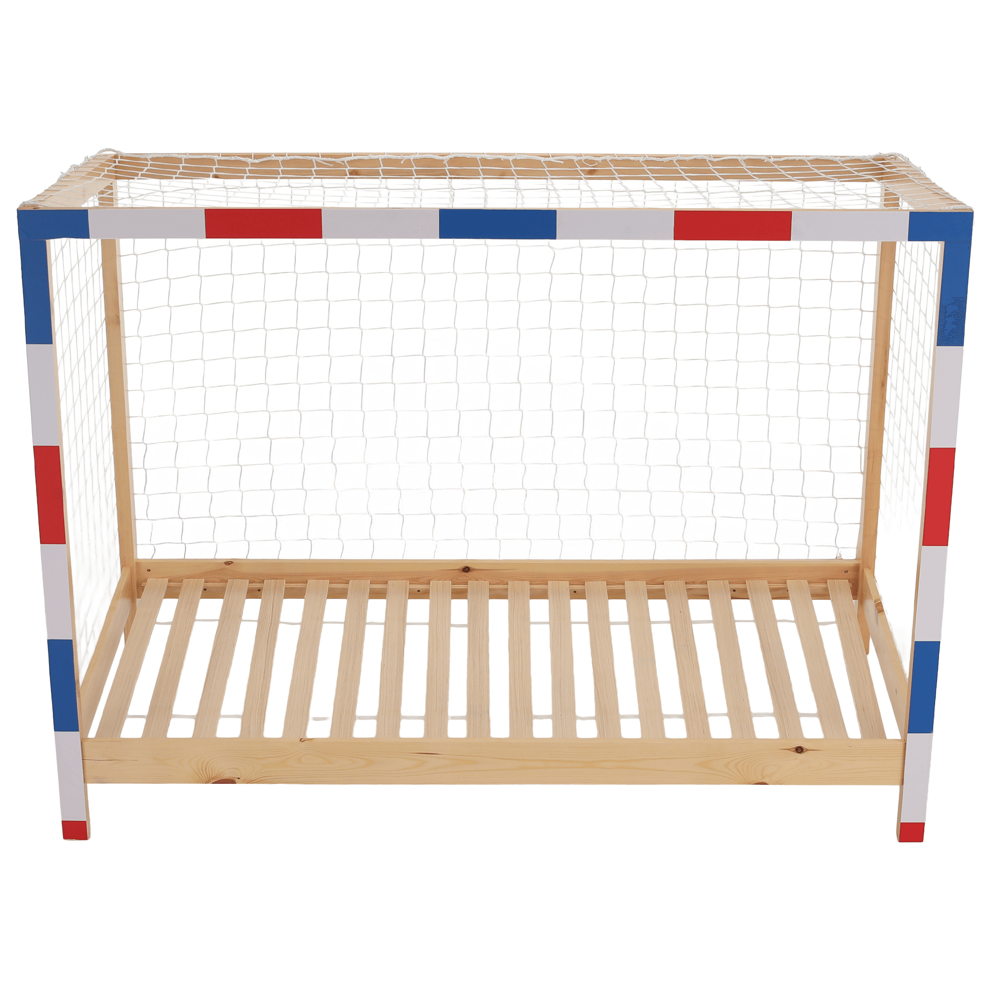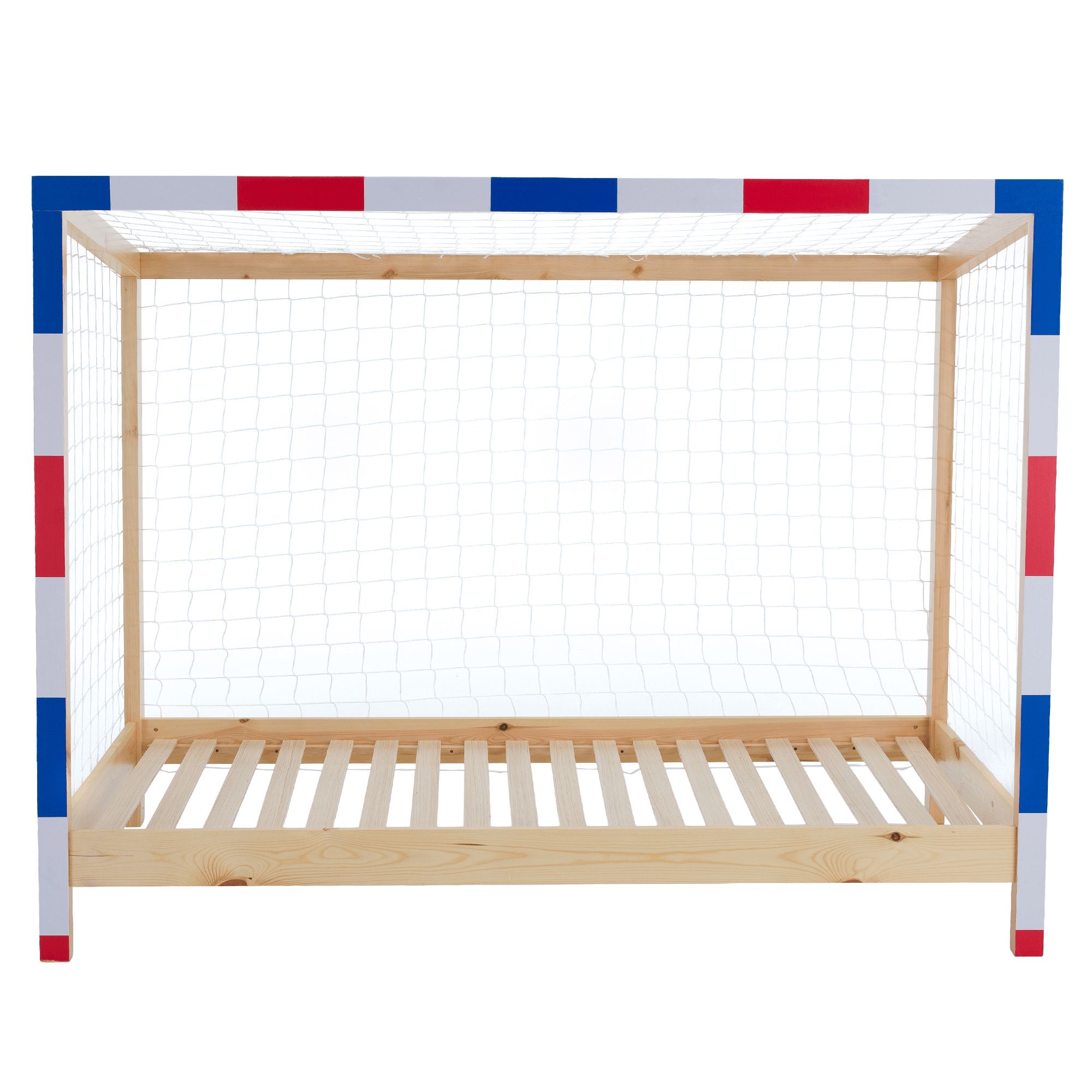 Materiál: masiv borovice Barva: přírodní/bílá/modrá/červená Rozměry (ŠxHxV): 206x96x165 cm Plocha na spaní (ŠxD): 90x200 cm Tloušťka materiálu: 2 cm Výška bočnice: 12 cm Výška zadní části: 149 cm Výška po rošt: 22 cm Nosnost: 95 kg Na nožičkách Výška nožiček: 16 cm Postel ve tvaru fotbalové brány Dodávána s překližkovým rolovaným roštem Dodávána bez matrace Možnost zakoupit pružinovou matraci z naší nabídky Doporučená maximální výška matrace: 15 cm Dodávána se sítí Barva sítě: bílá Dodáváno v demontu