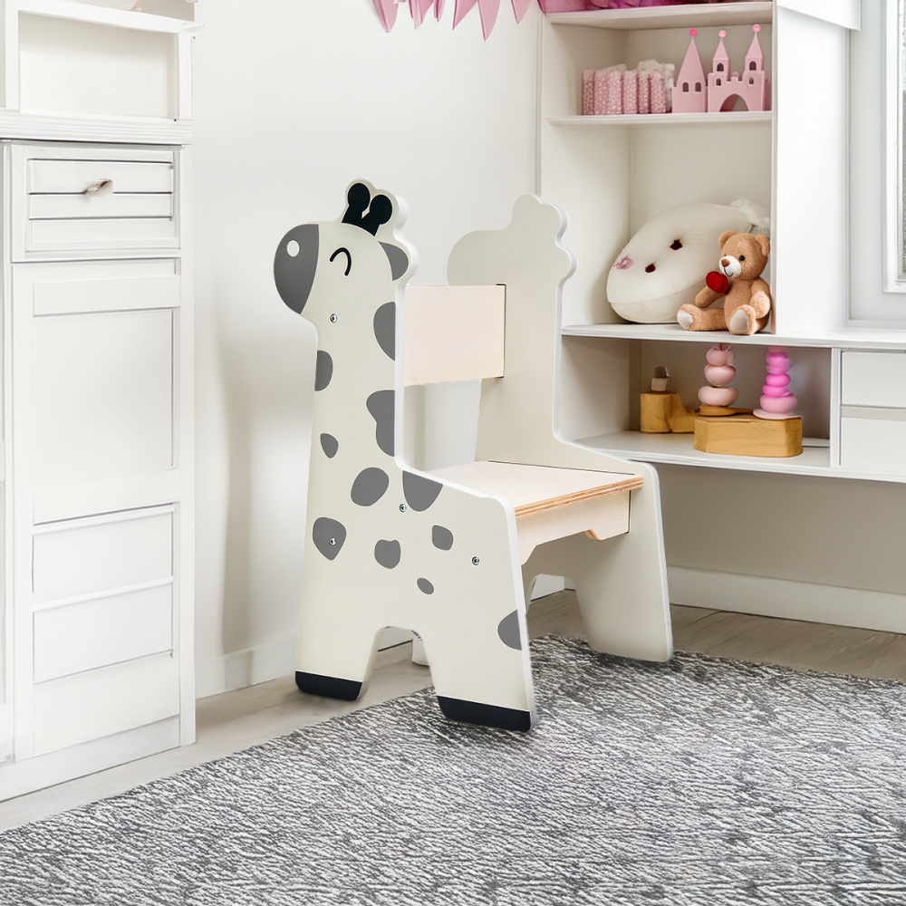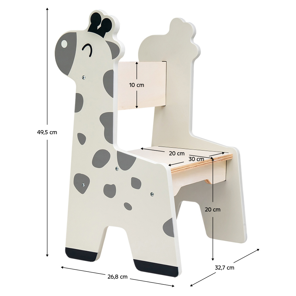 Materiál: MDF/překližka Barva: bílá/přírodní/dětský motiv žirafa Rozměry (ŠxHxV): 32,7x26,8x49,5 cm Výška sedu: 20 cm Tloušťka materiálu: 1,2-1,5 cm Podpora samostatnosti Multifunkční využití Židle ve tvaru žirafy Schůdky k dosažení vyšších míst Ideální pro kreslení, čtení, odpočinek Ideální pro dosažení umyvadla nebo poliček Vhodné do dětských pokojů Použití v interiéru Čistěte jemným navlhčeným hadříkem a následně otřete do sucha Neumisťujte tento výrobek blízko okna, aby jej dítě nevyužilo jako schůdek a nevypadlo Vhodné pro děti od 3 do 7 let Splňuje bezpečnostní normy EN 17191:2021 Nosnost: 50 kg Praktická Kouzelný design Dodáváno v demontu