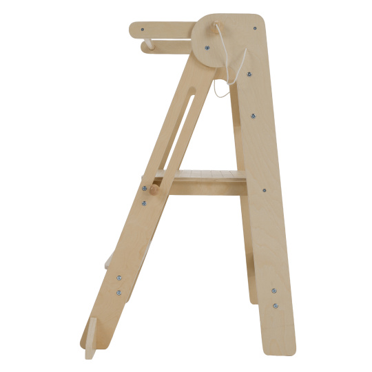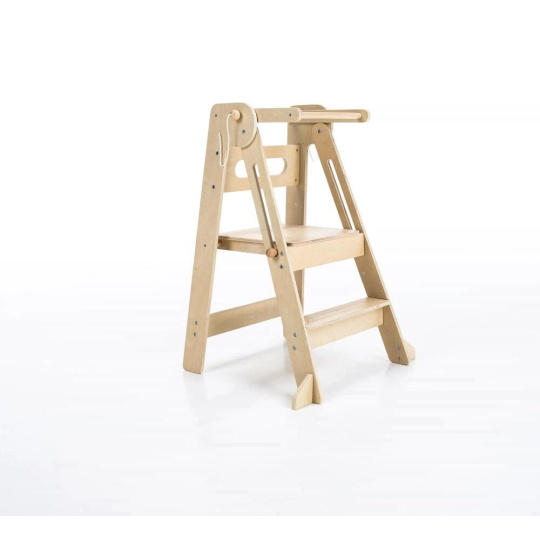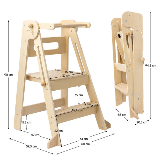 Materiál: překližka Barva: přírodní Rozměry (ŠxHxV): 68x58x90 cm Nosnost: max. 50 kg Hmotnost: 7 kg Tloušťka materiálu: 1,5 cm Montessori učící věž Skládací Jednoduchá manipulace Rozměry po složení (ŠxHxV): 68x20x95,5 cm Vede děti k samostatnosti a učení Zaoblené hrany Uzamykací mechanismus Použití v interiéru Používejte pouze na rovných površích Čistěte jemným navlhčeným hadříkem a následně otřete do sucha Určena pro děti starší jednoho roku, které dokáží stát bez pomoci Splňuje bezpečnostní normy EN 14988:2017 + A1:2020 Dodáváno v demontu