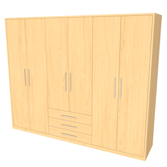 Mimořádná kombinace tří skříní AIDA. Vhodná do prostornějších místností. V tomto moderním designu se stane příjemnou součástí Vašeho domova. Sestava skříně AIDA 1+2+3+rám v šířce 275cm je vyrobena z lamina o síle 18 mm. Výběr z několika akčních dekorů. Kvalitní kování a spojovací materiál je bez použití plastových součástek, vyjma ochranných krytek. Výškově nastavitelné nohy pro dokonalé vyrovnání uvnitř skříně. 3D klipový pant s tlumením excentricky stavitelný. Zásuvky s 3D skrytými plnovýsuvy, snadné nastavení ve 3 směrech tak, aby zásuvka perfektně zapadla na místo a snadno vyjížděla. S tlumením s dotahem. Praktické a efektní ABS hrany. Skříň AIDA 1 - s jednou policí a volným prostorem se šatní tyčí. Skříň AIDA 2 - s policemi a zásuvkami. Skříň AIDA 3 - s jednou horní policí a dvěma šatními tyčemi nad sebou.