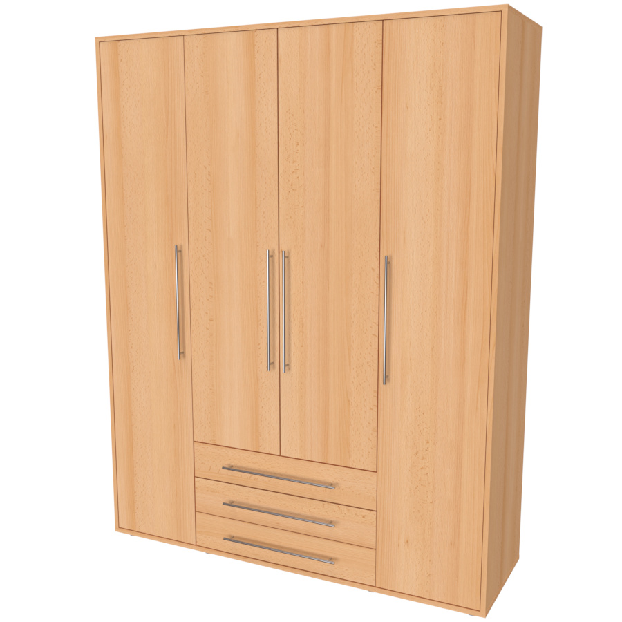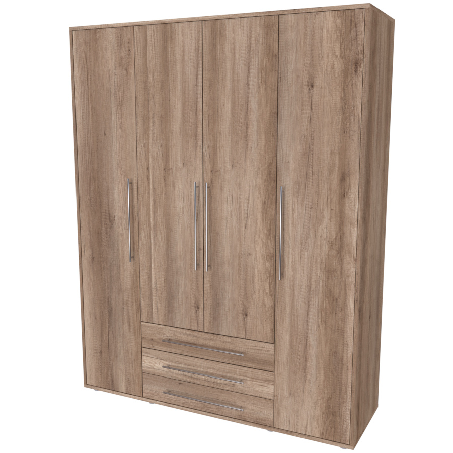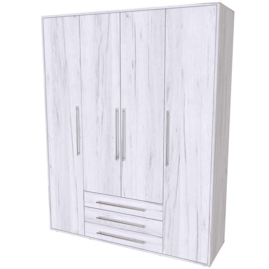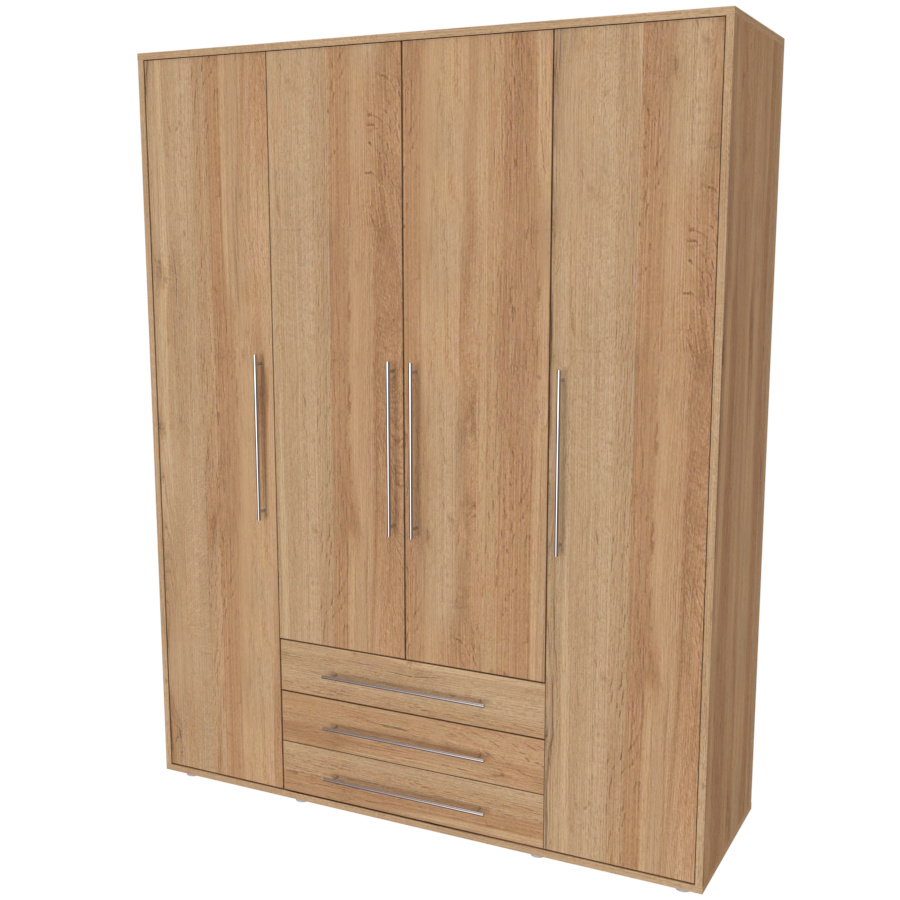 Moderní skříň, vhodná nejen pro rodinu, která potřebuje efektivně využít prostor. Elegantní provedení vhodné pro všechny generace. Vyrobeno z lamina o síle 18mm Kvalitní zásuvky a pojezdy jsou přizpůsobeny častému otevírání. Výběr akčních dekorů. Kvalitní kování a spojovací materiál je bez použití plastových součástek,vyjma ochranných krytek. Skříň má efektní a praktické ABS hrany. Výška nožek od země je 2 cm, nožičky jsou nastavitelné, maximální výška je 3 cm. Lze osadit zrcadlem. Dvě varianty vnitřního uspořádání. Skříň je z výroby připravena na obě varianty, rozložení si volíte až při montáži.