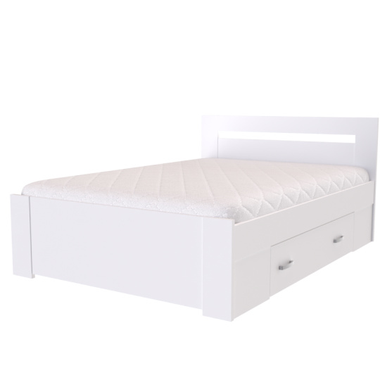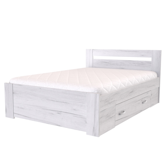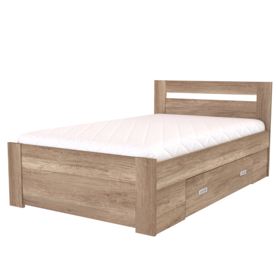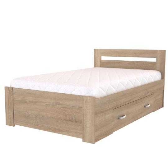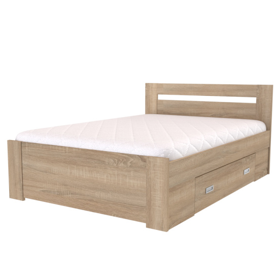 Lůžko v elegantním provedení, s ochrannými čely. Design, který lahodí oku milovníkům rustikálnosti a praktičnosti. Několik možností provedení a výběr úložných prostor nabízí nespočet variant pro Vaši spokojenost. Vyrobeno z lamina o síle 18 / 25 mm. Výběr akčních dekorů. Kvalitní kování a spojovací materiál je bez použití plastových součástek, vyjma ochranných krytek. Univerzální provedení pravé/levé. Rohové provedení s jedním úložným prostorem nebo se dvěma úložnými prostory. Dvě varianty za jednu cenu. Velký úložný prostor. Partnerská šířka 120 nebo 140 cm. Zvýšená lehací plocha 52 nebo 56 cm (včetně matrace o výšce 16 cm). Cena je bez matrace a roštu. Zátěž roštu do 120 kg.