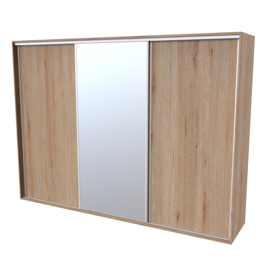 Řada skříní FLEXI 3 se vyznačuje svojí nadstandartní velikostí a úsporou místa díky posuvným dveřím. Snadné otvírání pomocí alu profilu s tlumícím kartáčem zaručuje tichý přístup nejen z levé a pravé strany (získáváte přístup i z prostřed skříně). Není tak potřeba úchytek. Skříně FLEXI nabízí možnost doplnění o zrcadlo, jenž opticky rozšíří Vaši ložnici, či o moderní kombinaci skla nebo druhého dekoru. Získáváte nespočet možností, jak skříň FLEXI zkombinovat, aby odpovídala co nejvíce Vašim představám. Vyrobeno z lamina o sílem 18/25 mm. Výběr z několika akčních dekorů. Kvalitní kování a spojovací materiál je bez použití plastových součástek, vyjma ochranných krytek. Výškově nastavitelné nohy pro dokonalé vyrovnání nepoškozují podlahu. Dvě varianty vnitřního uspořádání. Skříň je z výroby připravena na obě varianty, rozložení si volíte až při montáži. Hloubka skříní je 65 cm, možnost dveří s tlumením a dotahem. Praktické a efektní ABS hrany.