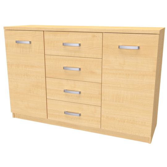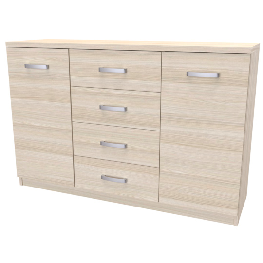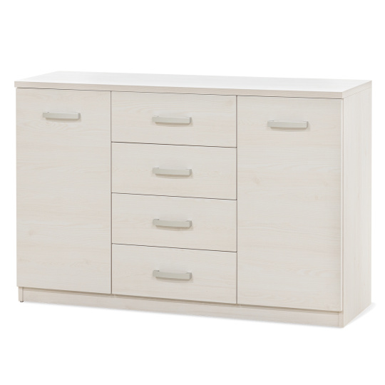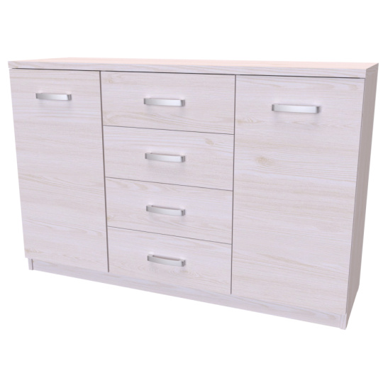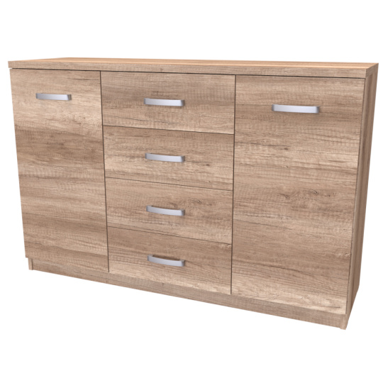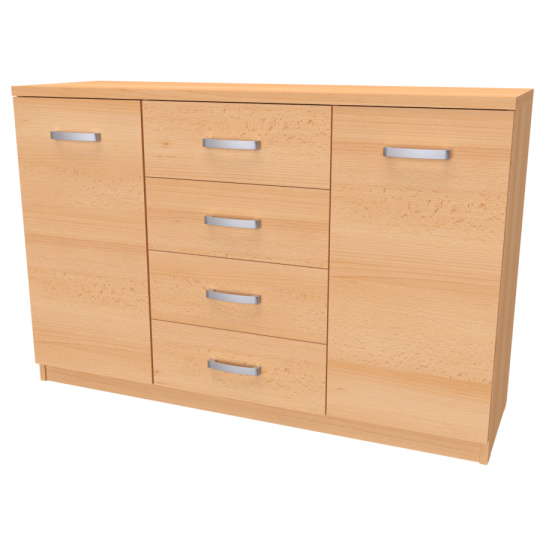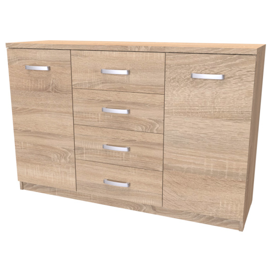 Komoda s dvířky a šuplíkem. Svým designem odlehčí prostor, kterým tak navodí pocit vzdušnosti celé místnosti. Výběr akčních dekorů. Kvalitní kování a spojovací materiál je bez použití plastových součástek,vyjma ochranných krytek. Na zásuvkách je kovový mechanismus, díky němuž lze zásuvku vysunout celou. Vyrobeno z lamina o síle 18 / 25 mm