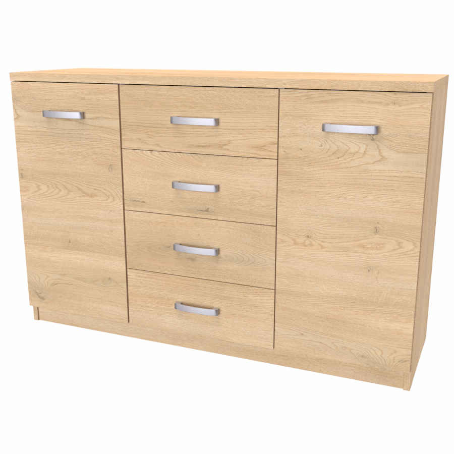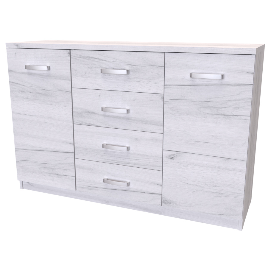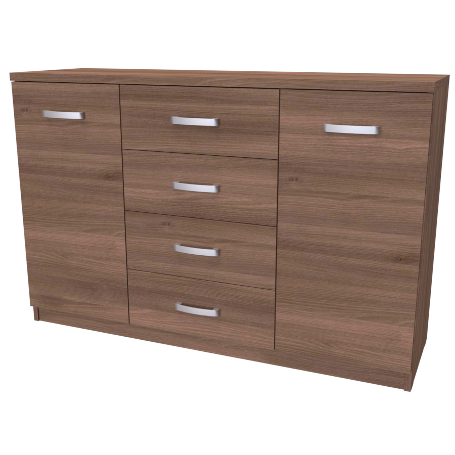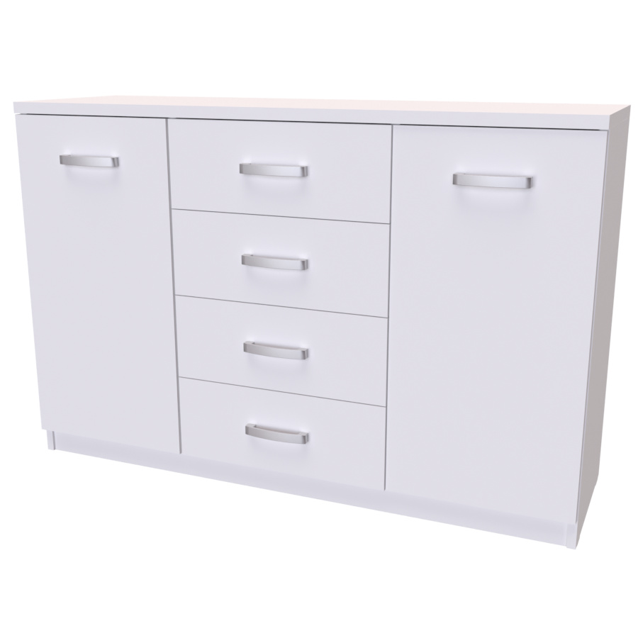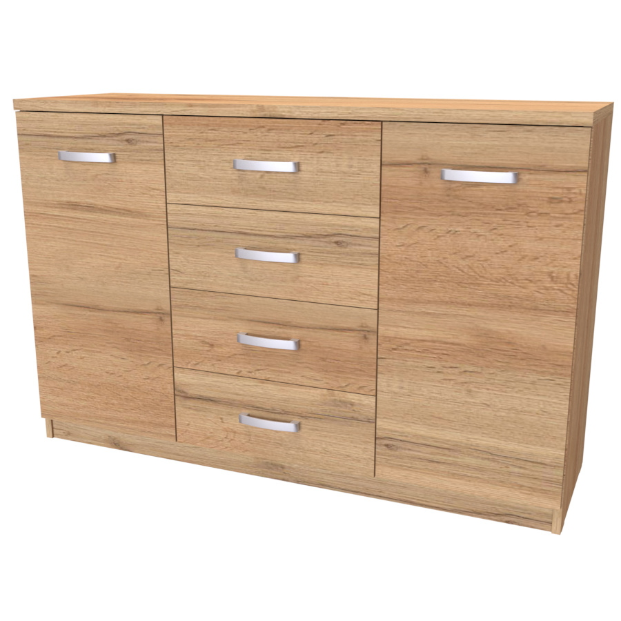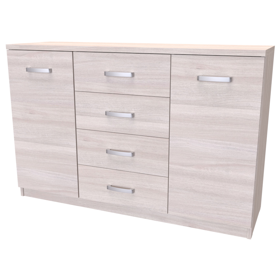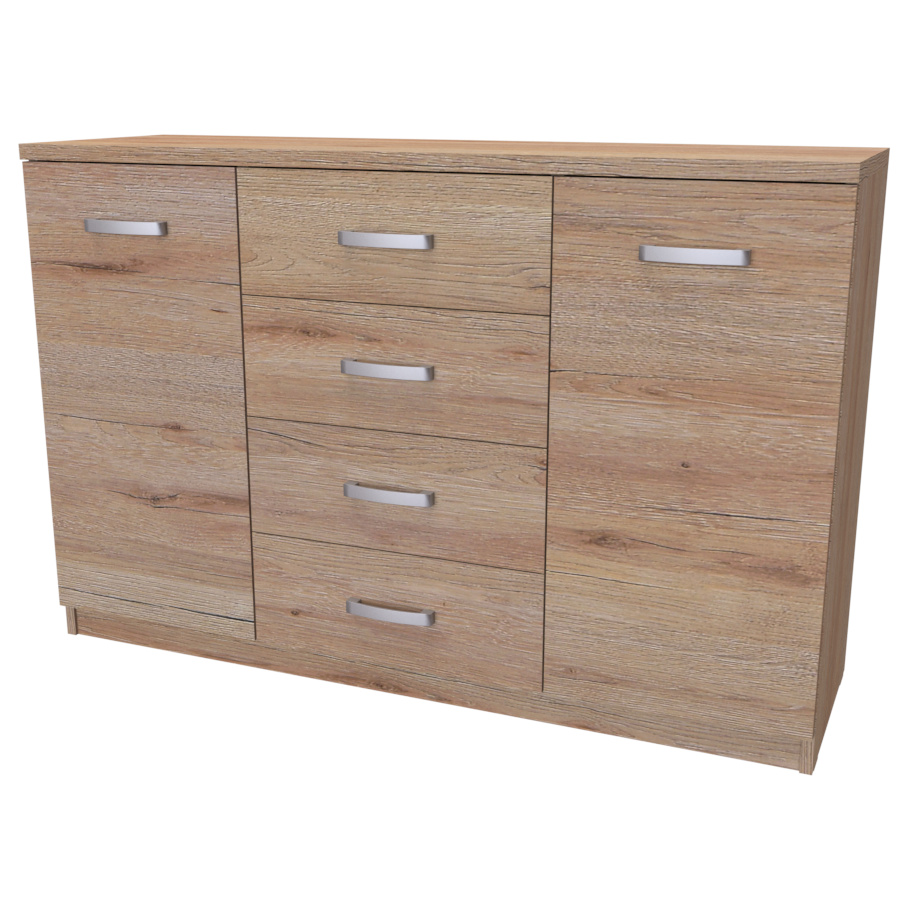 Komoda s dvířky a šuplíkem. Svým designem odlehčí prostor, kterým tak navodí pocit vzdušnosti celé místnosti. Výběr akčních dekorů. Kvalitní kování a spojovací materiál je bez použití plastových součástek,vyjma ochranných krytek. Na zásuvkách je kovový mechanismus, díky němuž lze zásuvku vysunout celou. Vyrobeno z lamina o síle 18 / 25 mm