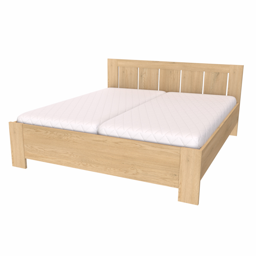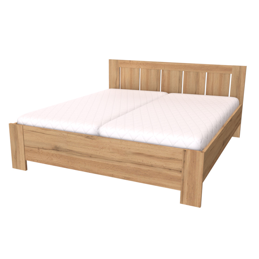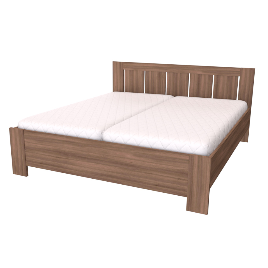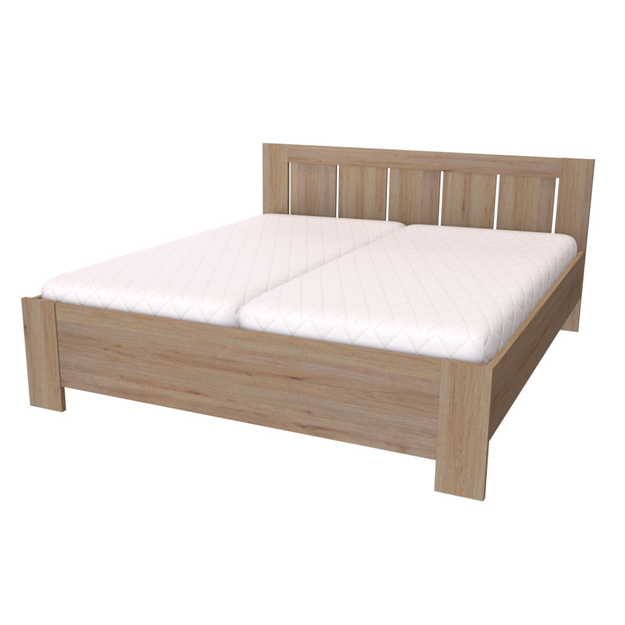 Toto dvoulůžko, v našem kvalitním provedení, najde své místo nejen v ložnici milovníků venkovského stylu, ale i zastánce moderny. Výplň čela v odlišném dekoru vytváří originální kombinaci barev, díky které se rozzáří celá Vaše ložnice. Čelo a nohy dvoulůžka jsou vyrobeny v síle lamina 25mm, bočnice 18 či 25mm. Výběr z několika akčních dekorů. Kvalitní kování a spojovací materiál je bez použití plastových součástek, vyjma ochranných krytek. Zvýšená lehací plocha 50 až 65 cm (včetně matrace o výšce 16 cm). Možnost volby roštu a matrace. Výškově nastavitelné kování do 8 poloh, lze tak rošt umístit do výšky od 32 do 43 cm dle typu matrace. Efektní a praktické ABS hrany. Značkové kování Hettich. Od šířky 120 cm kovová středová stabilizační noha.