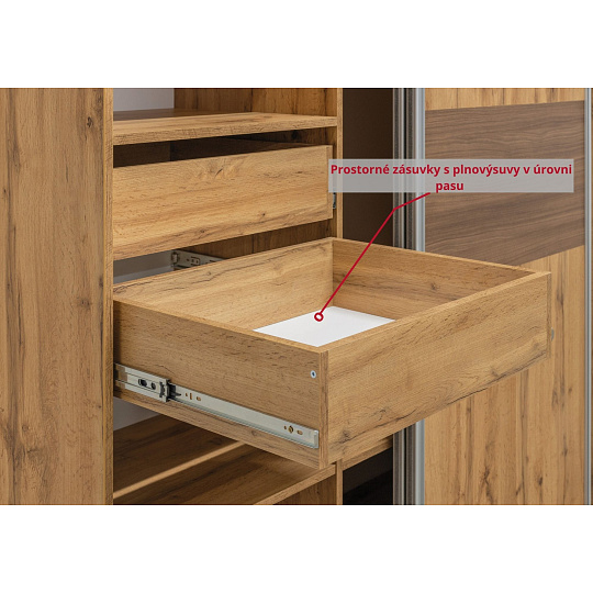 - Promyšlený úložný prostor – police, šatní tyč a zásuvky s plnovýsuvem ve výšce pasu, aby bylo vše po ruce bez ohýbání.