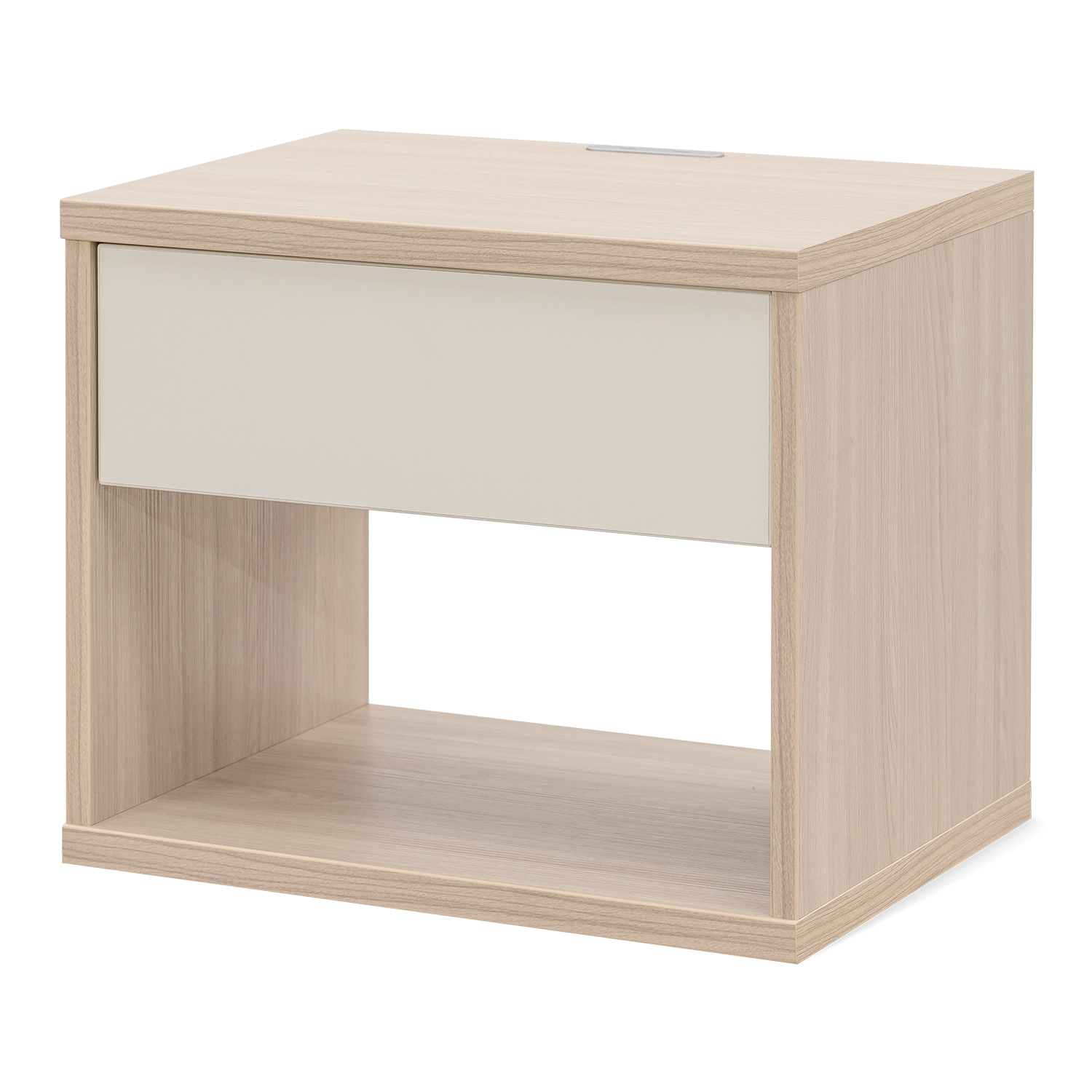 Noční stolek je určený k zavěšení na stěnu, ale můžete jej postavit i samostatně. Vyrobený je z laminované dřevotřísky v kombinaci síly 25 a 18 mm. Bez-úchytková zásuvka je vybavená skrytými plno-výsuvnými pojezdy s tlumením a dotahem. Součástí je kvalitní kování a spojovací materiál bez použití plastových součástek (vyjma ochranných krytek)