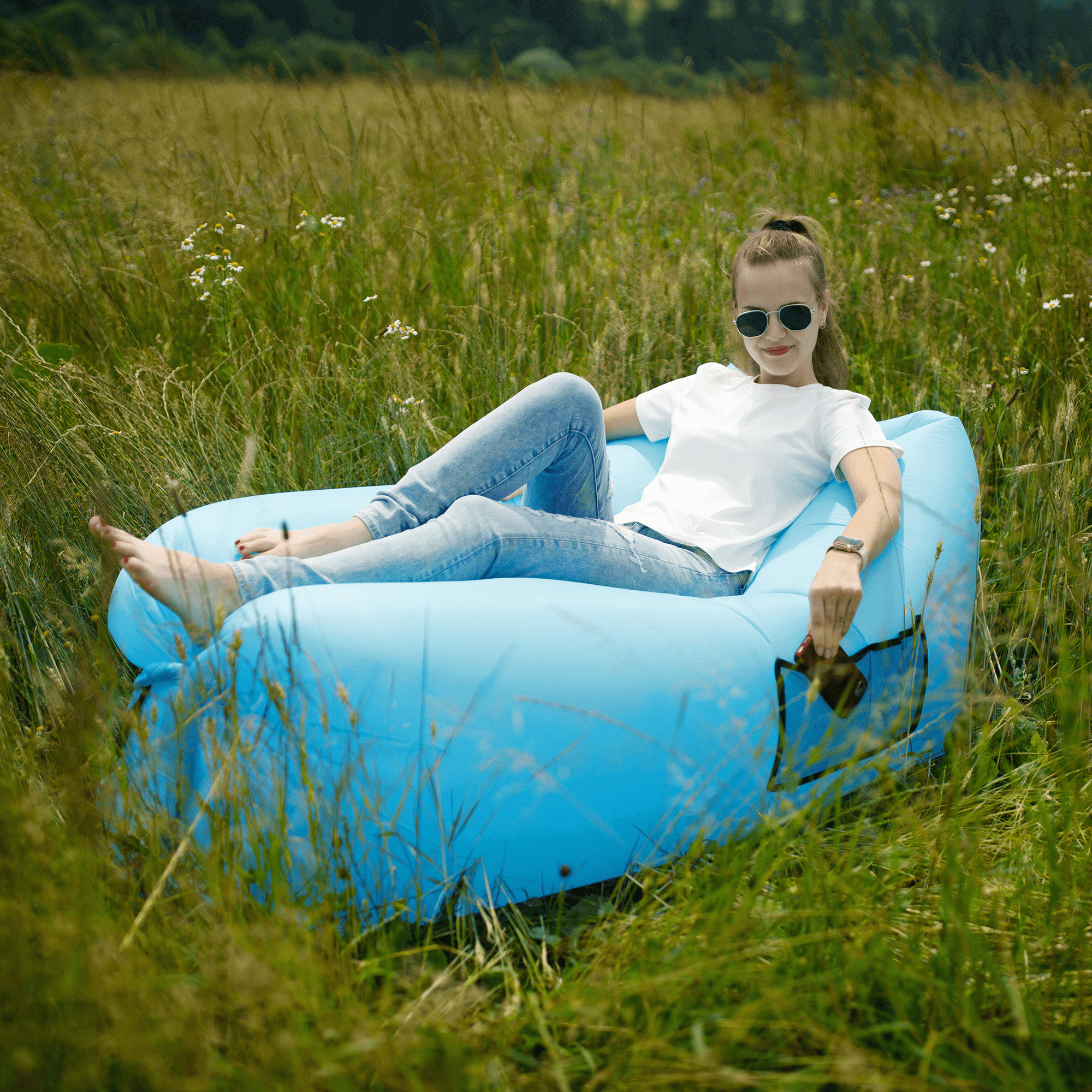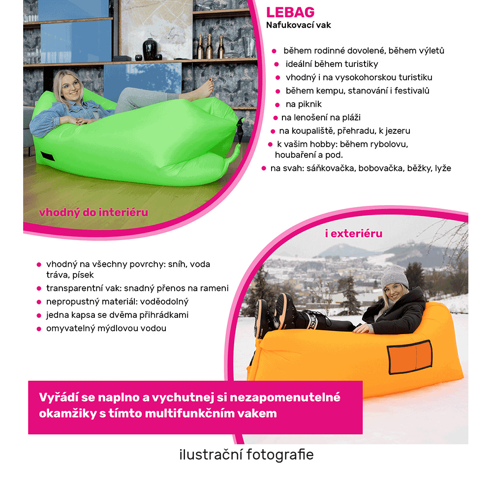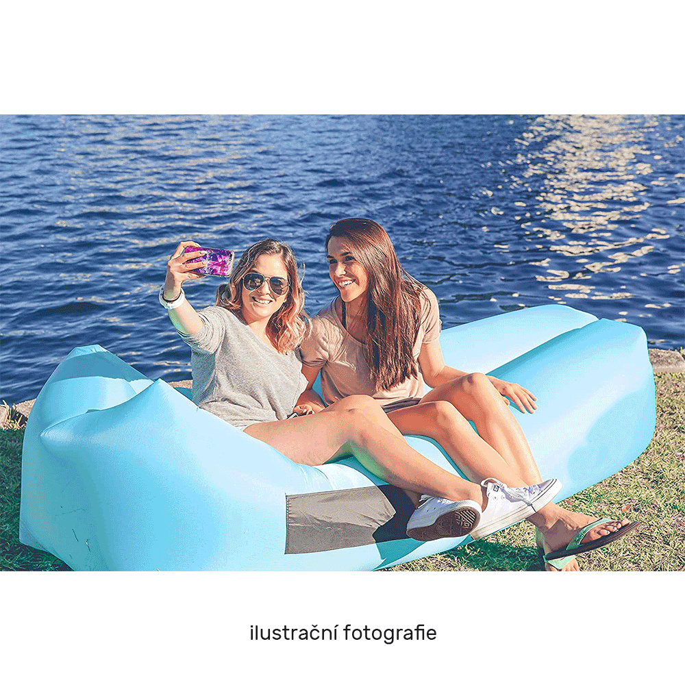 Materiál: nylon Barva: modrá Nenafúkaný stav (ŠxD): 50x70 cm Nafoukaný stav: 70x180 / 190/240 cm Samotnou velikost nafouknutého vaku si víš regulovat Hmotnost: pouze 0,80 kg Nosnost: 200 kg nafukovací Sedací vak Jedna kapsa se dvěma přihrádkami S transportním vakem Snadný přenos na rameni S popruhem přes rameno Vhodný na všechny povrchy Sníh, voda, tráva, písek voděodolný nepropustný materiál Omyvatelný mýdlovou vodou Vhodný do interiéru i exteriéru Vhodný do domácnosti, i do kanceláře na příležitostný relax Vhodný na zahradu, na terasu Během rodinné dovolené, během výletů Ideální během turistiky Vhodný i na vysokohorskou turistiku Během kempu, stanování na piknik během festivalů Na lenošení na pláži Na koupaliště, přehradu, k jezeru K vašim hobby: během rybolovu, houbaření apod. Na svah: sáňkovačka, bobovačka, běžky, lyže jednoduchá obsluha Snadná údržba Vzduchový vak Snadné a rychlé naplnění za pár vteřin Bezpumpové nafukování Možnost regulace objemu podle potřeby flexibilní použití Dodávané v demontu