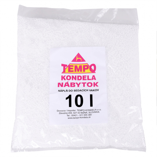 Materiál: polystyren Barva: bílá Objem: 10 l zdraví nezávadné Vhodné i pro alergiky a děti pravidelný tvar vzdušnost lehký materiál Jednoduché doplňování Regulování tuhosti vaku Dodávané v pytli