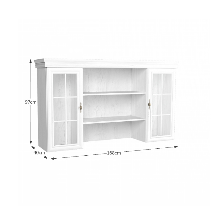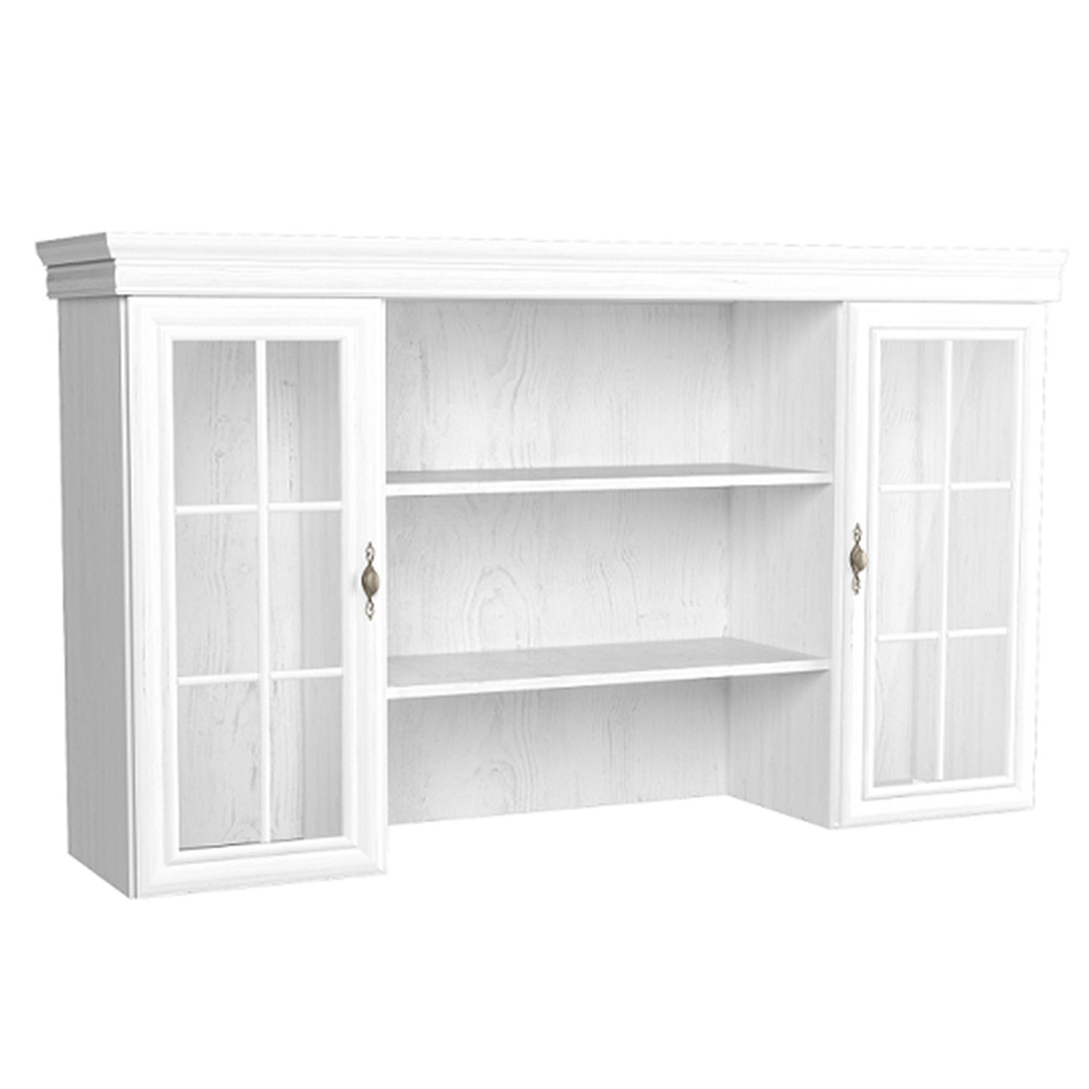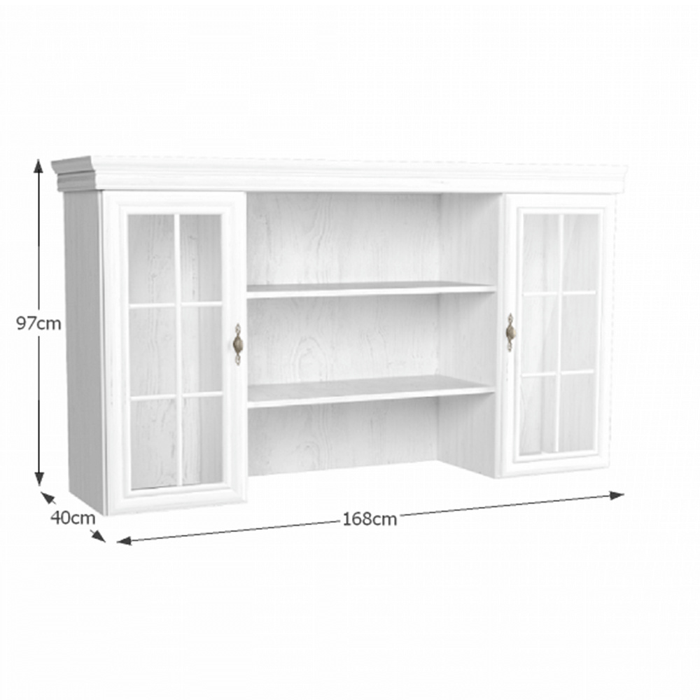 Nástavec KN5 KORA. Barevné provedení sosna andersen. Materiál laminovaná DTD, MDF, kov, sklo. Rozměry (ŠxHxV): 168x40x97 cm Tloušťka materiálu korpus: 15 mm Tloušťka materiálu vrchní desky: 22 mm Tloušťka materiálu dolní desky: 22 mm