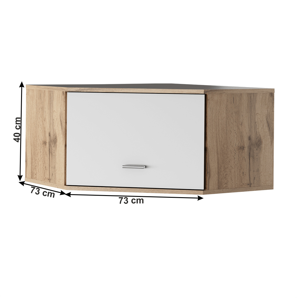 Materiál: DTD laminovaná Barva: dub wotan/bílá Rozměry (ŠxHxV): 73x73x40 cm rohový S policí S úchytkami Kvalitní slovenský výrobek Dodávané v demontu