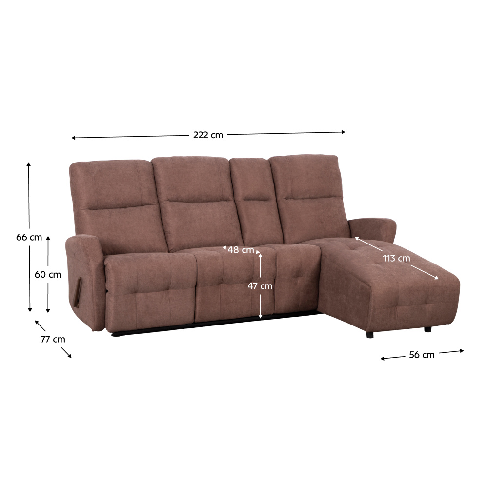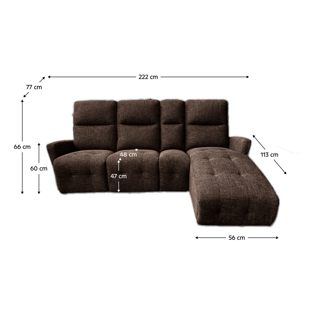 Materiál: látka/kov Oděruodolnost textilie podle testu Martindale: 20 000 oděrů Barva: hnědá Rozměry (ŠxHxV): 222x80x100 cm Výška sedu: 47 cm Hloubka sedu: 52 cm Výška područky: 60 cm Hloubka otomanu: 120 cm Šířka otomanu: 62 cm Nosnost: 100 kg Výplň: pružina falista+Pur pěna Pravé provedení Rohová Celočalouněná Nastavitelná S funkcí polohování levé strany Mechanické polohování Podnož vysunete pomocí páčky Sklápěcí držák na občerstvení Dodáváno v demontu