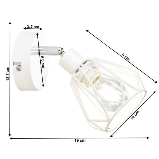 Materiál: kov Barva: bílá Celkové rozměry (ŠxHxV): 19x10x18,7 cm Rozměry podstavce (ŠxHxV): 8,5x8,5x2,5 cm Rozměry stínítka (ŠxHxV): 10x10x9 cm Doporučený typ žárovky (závit): E14 Maximální příkon žárovky: 40 W Napětí: 220-240 V Nástěnná lampa Ohebná část ramene Moderní design Dodávána bez žárovky Vhodná do interiéru a krytých teras Dodáváno v demontu