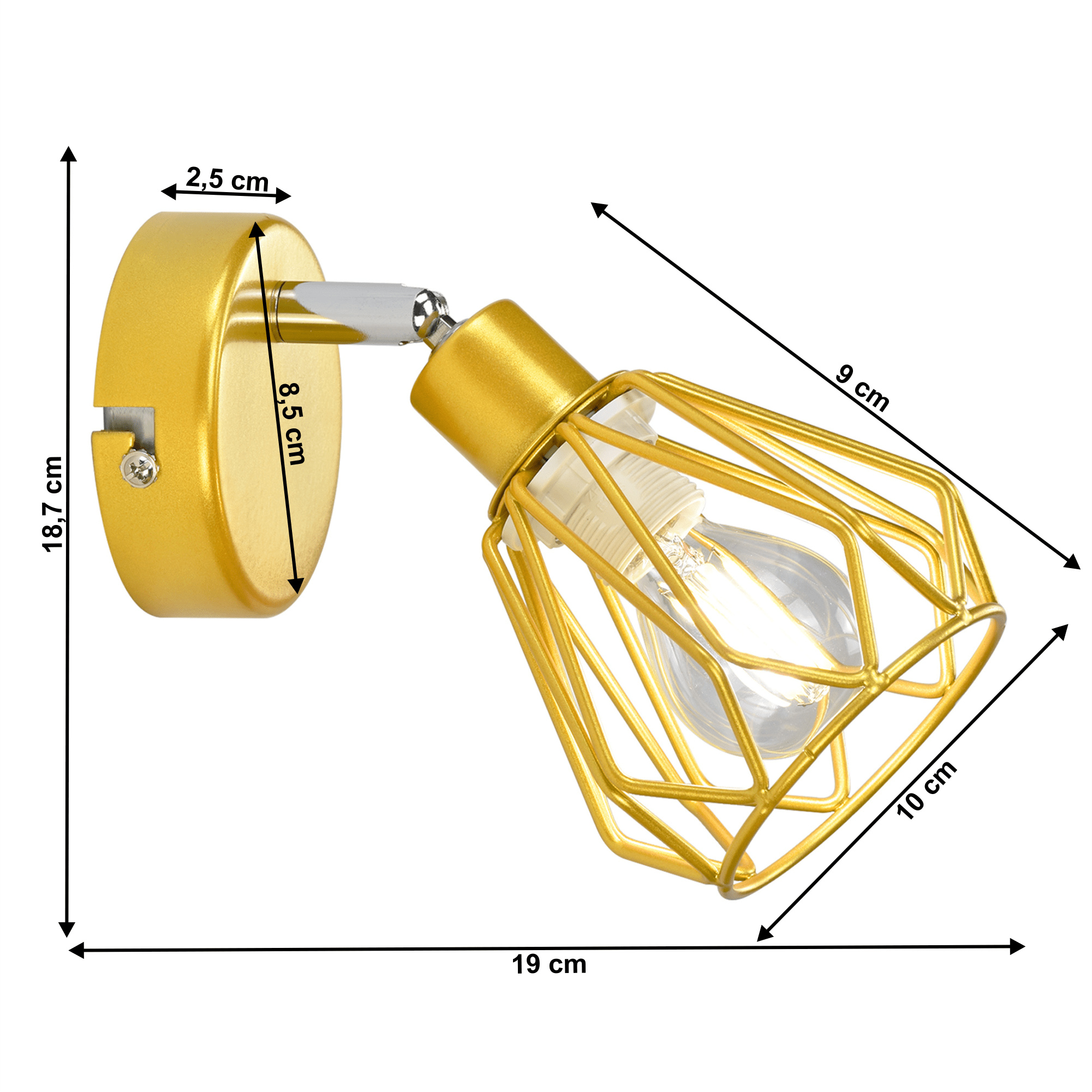 Materiál: kov Barva: zlatá Celkové rozměry (ŠxHxV): 19x10x18,7 cm Rozměry podstavce (ŠxHxV): 8,5x8,5x2,5 cm Rozměry stínítka (ŠxHxV): 10x10x9 cm Doporučený typ žárovky (závit): E14 Maximální příkon žárovky: 40 W Napětí: 220-240 V Nástěnná lampa Ohebná část ramene Moderní design Dodávána bez žárovky Vhodná do interiéru a krytých teras Dodáváno v demontu