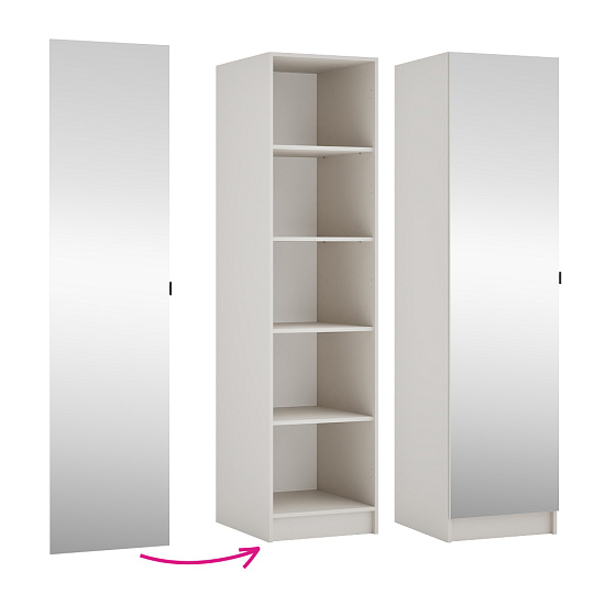 Materiál: laminovaná DTD/ABS hrany/sklo Barva: kašmír Rozměry (ŠxHxV): 49,6x1,6x189,3 cm Tloušťka materiálu DTD: 1,6 cm Tloušťka materiálu ABS: 0,2 cm Se zrcadlem Univerzální dvířka Tichý domek Panty S úchytkou Materiál úchytky: plast Barva úchytky: černá Možnost kombinovat s odstínem dub artisan Vhodné ke korpusu KREO 50, 100, 150 Dodáváno v demontu