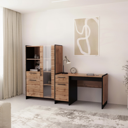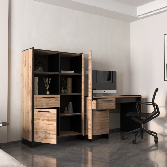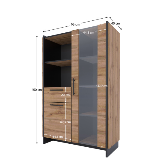 Materiál: DTD laminovaná/ABS hrany/sklo Barva: dub wotan/černá Rozměry (ŠxHxV): 96x45x150 cm Tloušťka materiálu: 1,6 cm Kovové úchytky Barva úchytek: černá Obsahuje dvířka se sklem Skříňka s dvířky Policová Nosnost police: 5 kg Otevřený úložný prostor Šuplík Nosnost šuplíku: 5 kg Výška šuplíku: 20 cm Dvojitá laminovaná DTD Plastové nožičky Bez LED osvětlení Možnost dokoupení LED osvětlení Moderní design Doporučujeme připevnit ke stěně Dodáváno v demontu