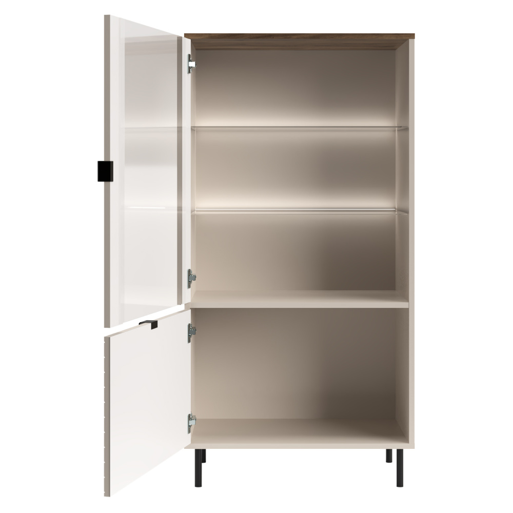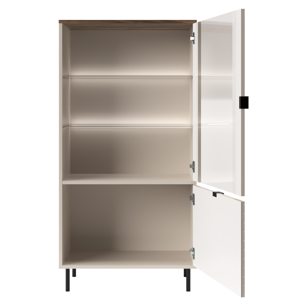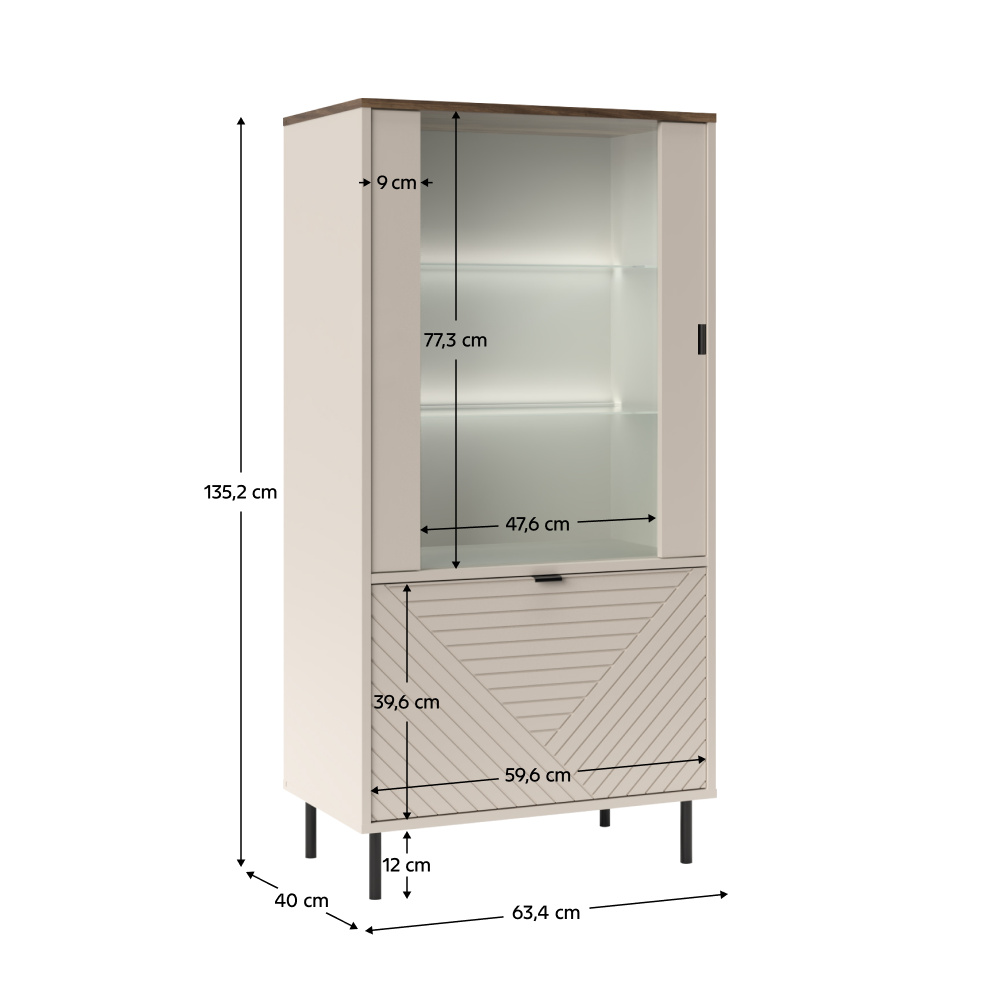 Materiál: laminovaná DTD/fóliovaná MDF/ABS hrany/sklo Barva: kašmír/dub castello Rozměry (ŠxHxV): 63,4x40x135,2 cm Tloušťka materiálu: 1,6 cm Dvoudveřová Dvě skříňky Rozměry spodní skříňky (ŠxV): 59,6x39,6 cm Policová Skleněná výplň Rozměry skleněné výplně (ŠxV): 47,6x77,3 cm Univerzální dvířka S úchyty Materiál úchytek: kov Barva úchytek: černá Na nožičkách Materiál nožiček: kov Barva nožiček: černá Výška nožiček: 12 cm Nosnost police: 5 kg Nosnost skleněné police: 3 kg Dekorativní dvířka Moderní design Doporučujeme připevnit ke stěně Bez LED osvětlení Možnost dokoupit LED z naší nabídky Dodáváno v demontu