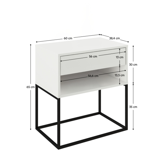 Materiál: DTD laminovaná/kov Barva: bílá/černá Rozměry (ŠxHxV): 60x38,4x65 cm Tloušťka materiálu: 1,6 cm Otevřený úložný prostor Rozměry otevřeného úložného prostoru (ŠxV): 56,6x13,5 cm Jeden šuplík Výška šuplíku: 13 cm Kovová podstava Výška podstavy: 35 cm Noční stolek Příruční stolek Nosnost: 10 kg Nosnost šuplíku: 5 kg Doporučujeme připevnit ke stěně Kvalitní slovenský výrobek Dodáváno v demontu