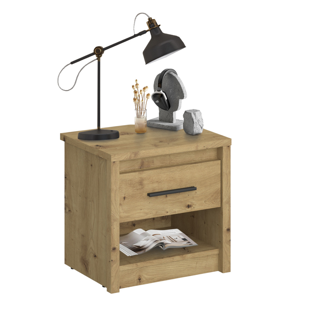 Materiál: DTD laminovaná/ABS hrany Barva: dub artisan Rozměry (ŠxHxV): 46,4x36,2x45,6 cm Tloušťka materiálu: 1,6-3,2 cm Plastové úchytky Barva úchytek: černá Otevřená odkládací plocha Šuplík Výška šuplíku: 15,7 cm Plastové nožičky Moderní design Dodáváno v demontu
