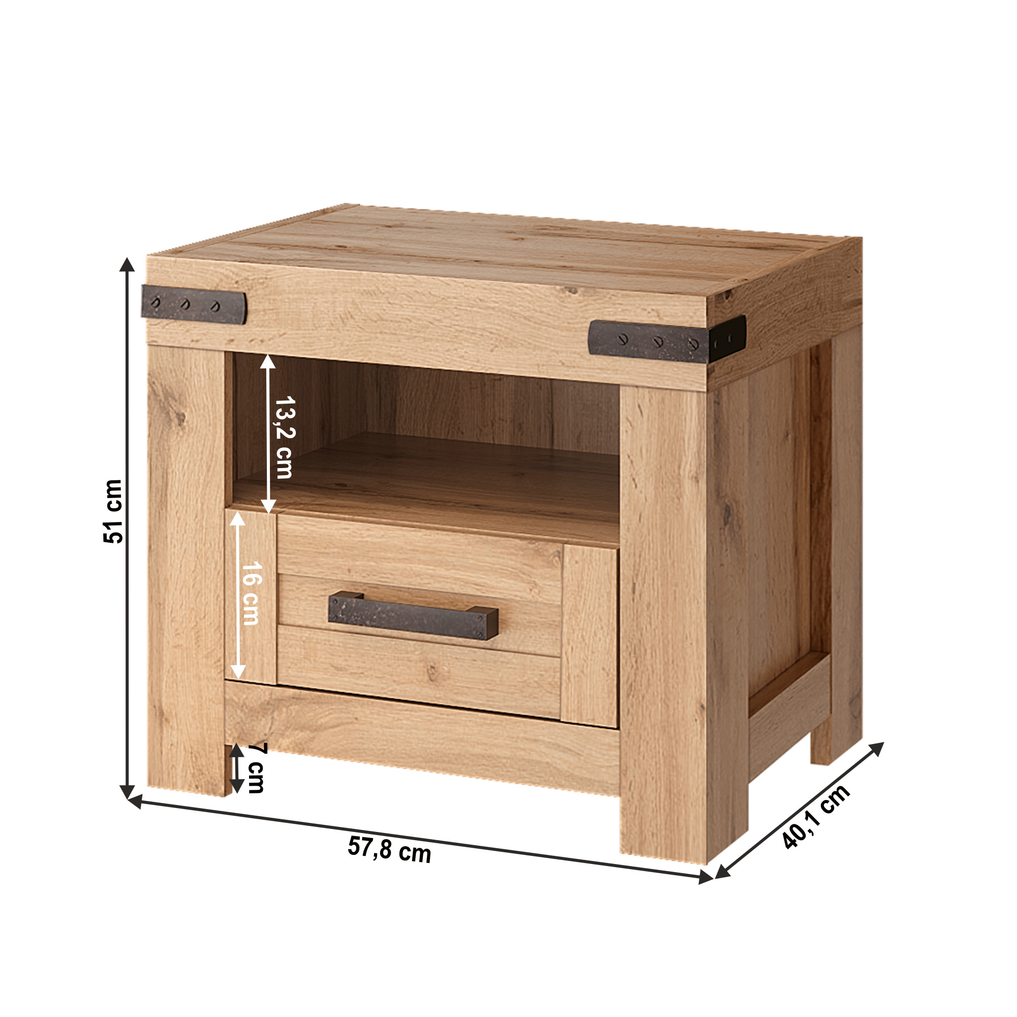 Noční stolek MORATIZ 1S Materiál: DTD laminovaná/MDF/plast Barva: dub wotan Rozměry (ŠxHxV): 57,8x40,1x51 cm Výška nožiček: 7 cm Tloušťka materiálu: 1,6-2,2 cm Kombinovaný Jeden šuplík Výška šuplíku: 16 cm Otevřená odkládací plocha Výška otevřené odkládací plochy: 13,2 cm MDF dvířka Dodávána v demontu