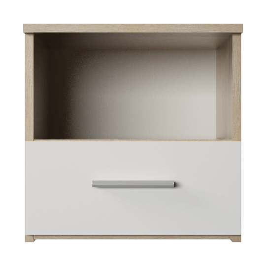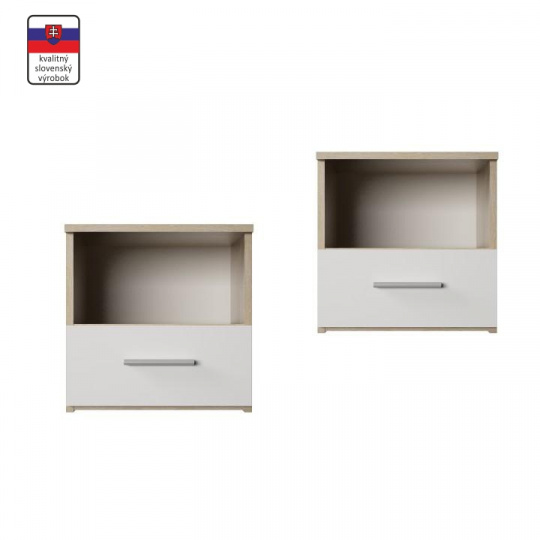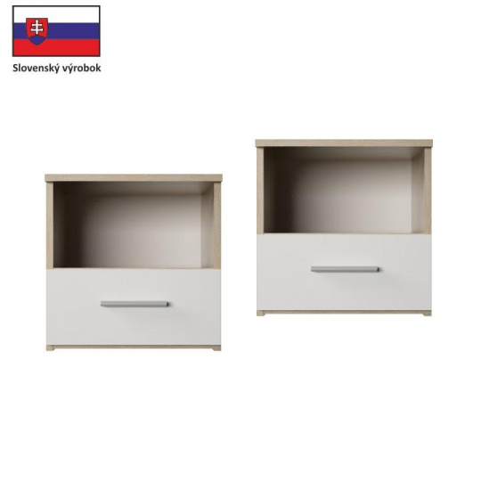 Materiál: DTD laminovaná Barva: dub sonoma/bílá Rozměry nočního stolku (ŠxHxV): 41,8x38x40 cm S jedním šuplíkem Otevřená odkládací plocha Výška šuplíku: 18,5 cm Výška otevřené odkládací plochy: 18 cm Tloušťka materiálu: 1,6 cm Dodáváno 2 kusy Kvalitní slovenský výrobek Dodáváno v demontu