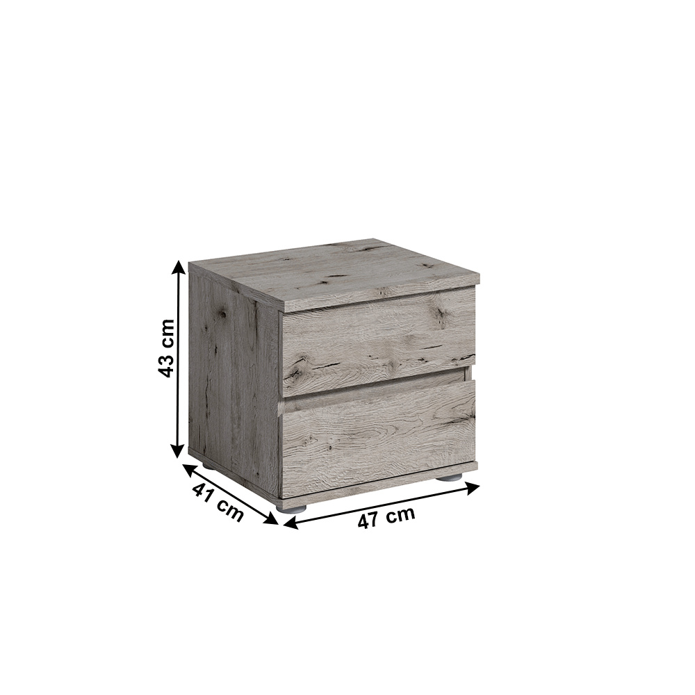 V balení 2 kusy Materiál konstrukce: DTD laminovaná Barva: dub Welington Rozměry (ŠxHxV): 47x41x43 cm Nosnost: 10 kg Se dvěma zásuvkami na nožičkách Pevná a stabilní konstrukce Ze ložnicové sestavy Togos Dodávané v demontu