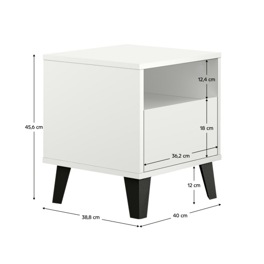 Materiál: laminovaná DTD Barva: bílá Rozměry (ŠxHxV): 40x38,8x45,6 cm Výška spodního prostoru od podlahy: 12 cm 1 šuplík Rozměr šuplíku (ŠxV): 36,2x18 cm Otevřený úložný prostor Výška otevřeného prostoru: 12,4 cm Na nožičkách Barva nožiček: černá Nosnost šuplíku a police: 5 kg Nosnost vrchní desky: 15 kg Moderní styl Bez úchytek Doporučujeme připevnit ke zdi Dodáváno v demontu