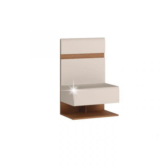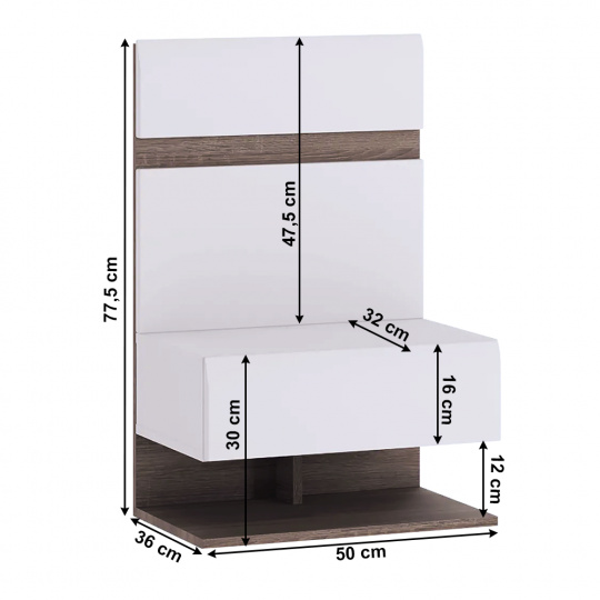 Noční stolek LYNATET 95 Materiál: laminovaná DTD Barva: dub sonoma truflový/bílá s extra vysokým leskem Rozměry (ŠxHxV): 50x36x77,5 cm Tloušťka materiálu: 16 mm Jeden šuplík Korpus je v matném provedení Dvířka jsou v provedení extra vysoký lesk Otevřený úložný prostor Dodáváno v demontu