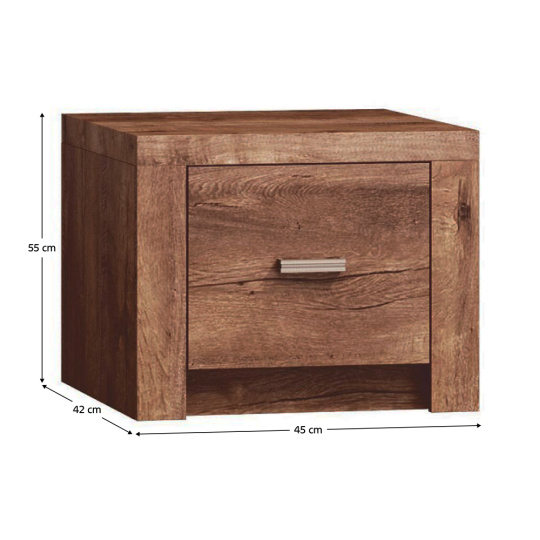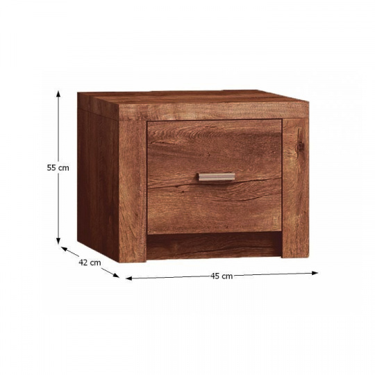 Noční stolek z luxusního sektorového nábytku. Korpus hrubý až 48 mm, Tloušťka materiálu zbývající části: 16 mm, úchytky kovové Materiál: DTD laminovaná / ABS hrany, barevné provedení: jasan tmavý, Rozměry ŠxHxV: 45x42x55 cm. Dodávané v demontu. Hmotnost: 16.2kg